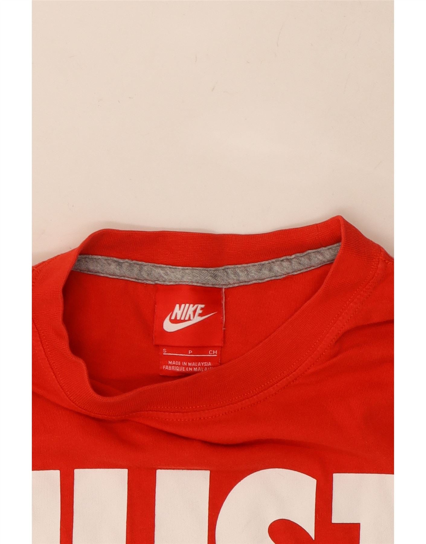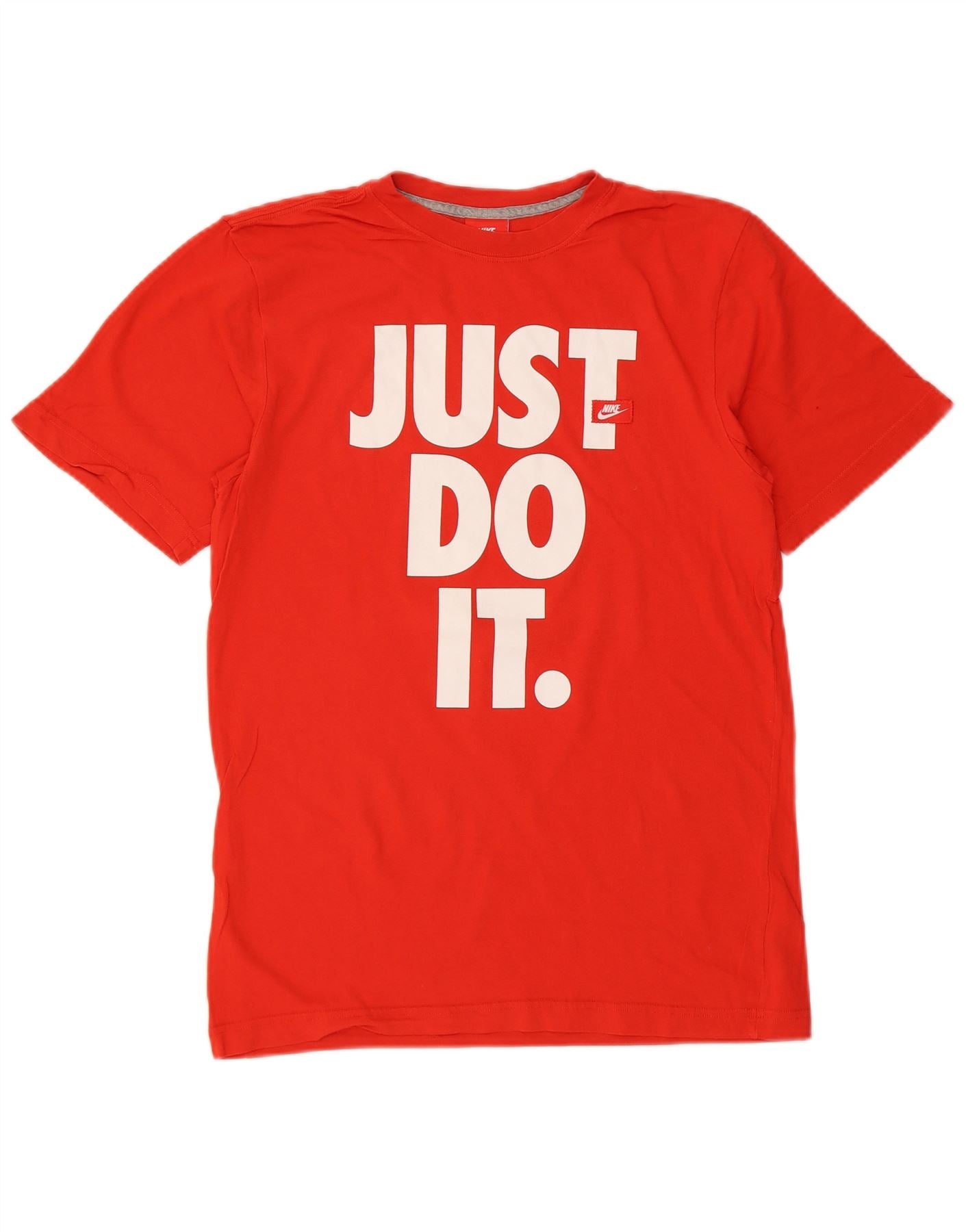 - AI Description: This Nike mens Graphic T-Shirt Top is crafted from soft red jersey fabric, offering a smooth and comfortable feel. It features a classic round neck and short sleeves. The pullover design ensures an easy, regular fit. A prominent JUST DO IT logo provides a bold graphic accent. This sports style top prioritises comfort and a clean silhouette, perfect for everyday wear or athletic activities.