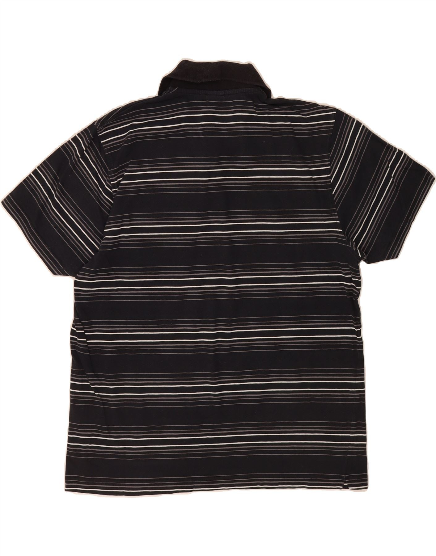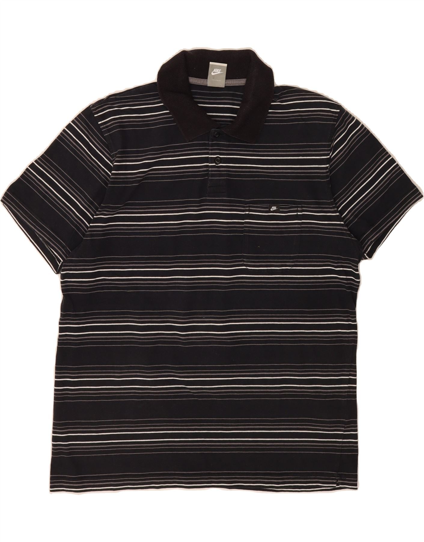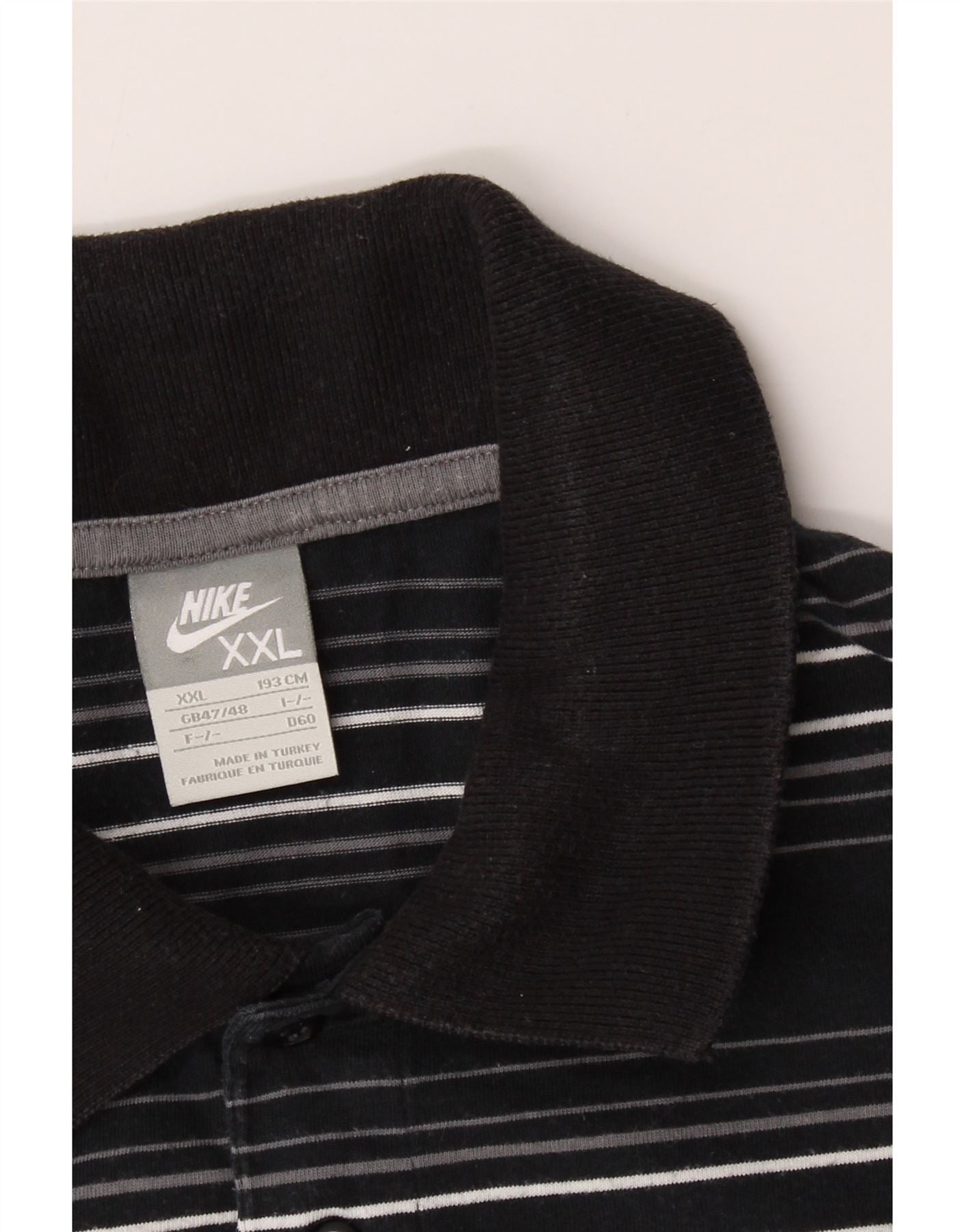 - AI Description: This pre-owned Nike T-shirt is a stylish sports top for men. Crafted from comfortable black jersey fabric, it features a collared neckline and short sleeves. The regular fit ensures a relaxed feel. This XXL T-shirt showcases a striped pattern and graphic design. Additional details include a button closure, logo accent and pockets. In excellent condition, this collared T-shirt top is made in Turkey.