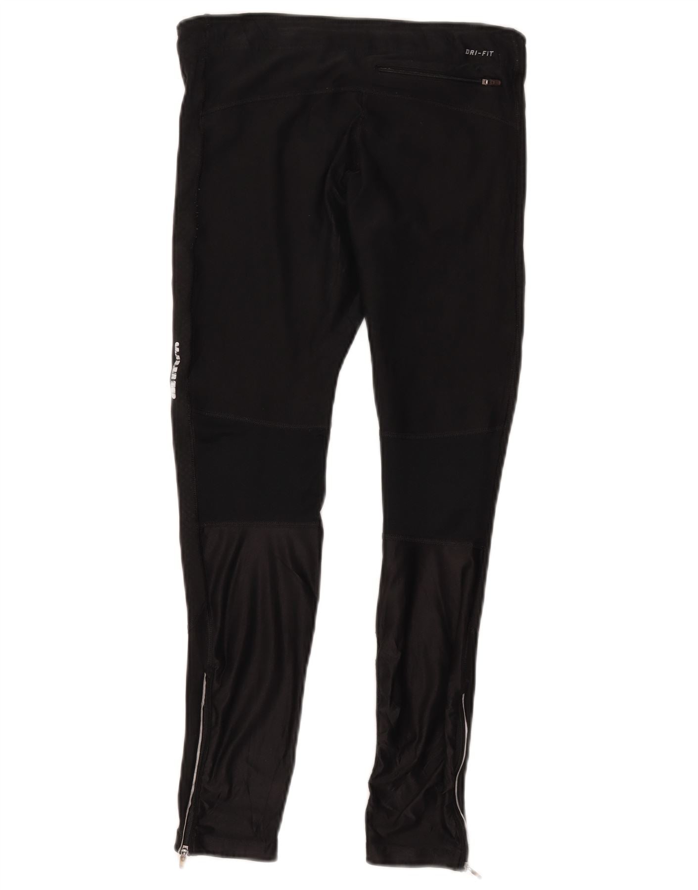 - AI Description: This Nike womens Dri-Fit running leggings are crafted from a breathable black polyester blend. The fabric offers excellent stretch for optimal movement. A slim fit contours the legs, providing a streamlined silhouette. The pull-on design ensures comfort and ease. Ankle zips allow for adjustable ventilation and easy changing. A subtle Nike logo adds a signature athletic detail.