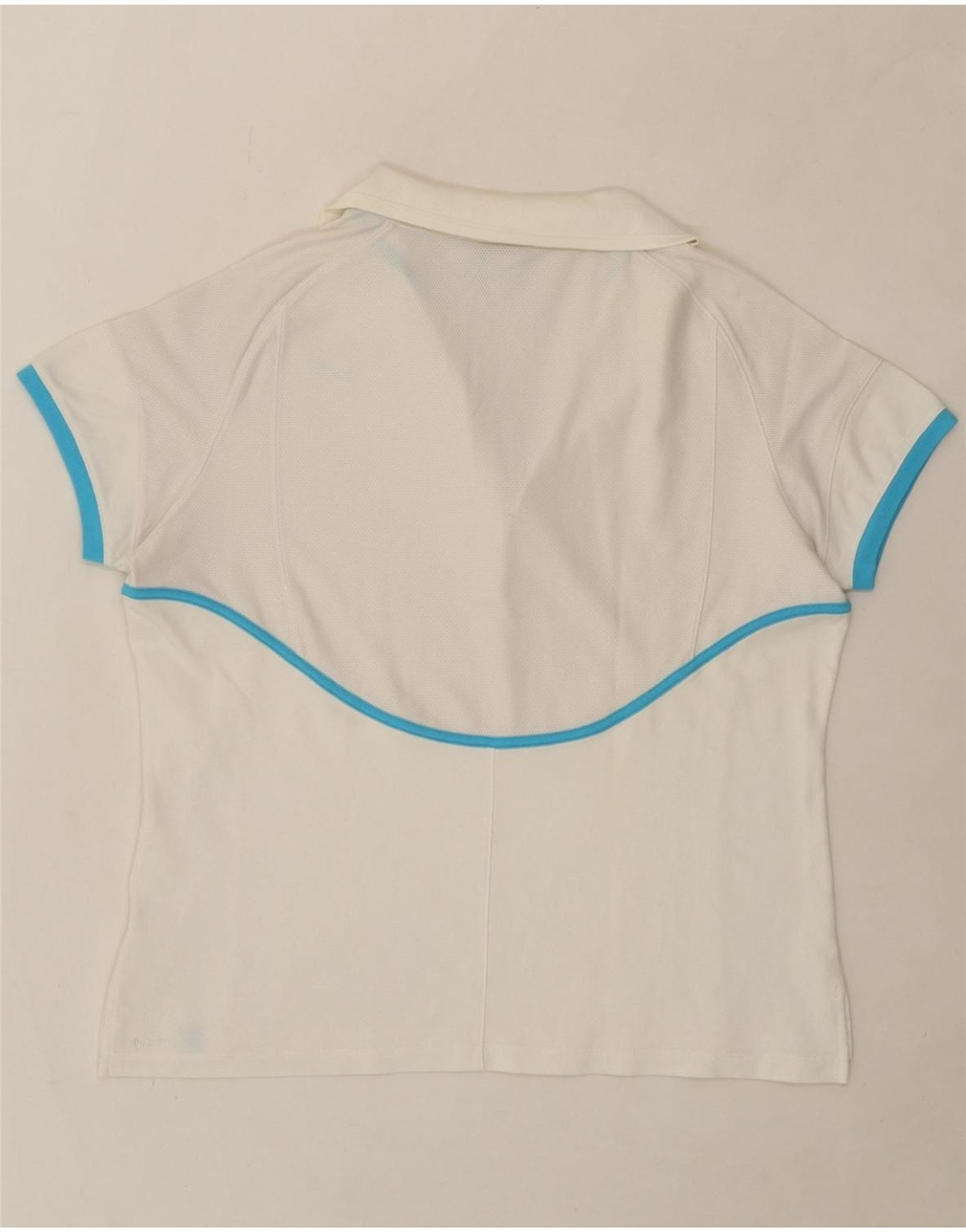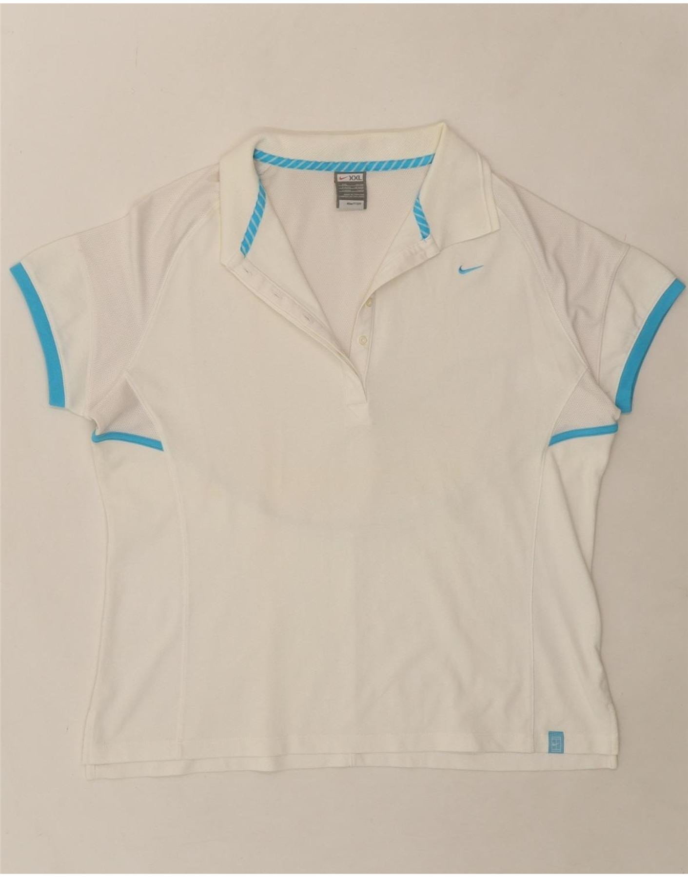 - AI Description: This pre-owned Nike women's T-shirt top is in excellent condition. A white, short-sleeved sports top in size XXL, it features a collared neckline and button closure. The regular fit design includes a breathable mesh fabric and showcases a logo accent. The graphic fabric fit adds visual interest. Accents include a button detail. Made in Thailand.