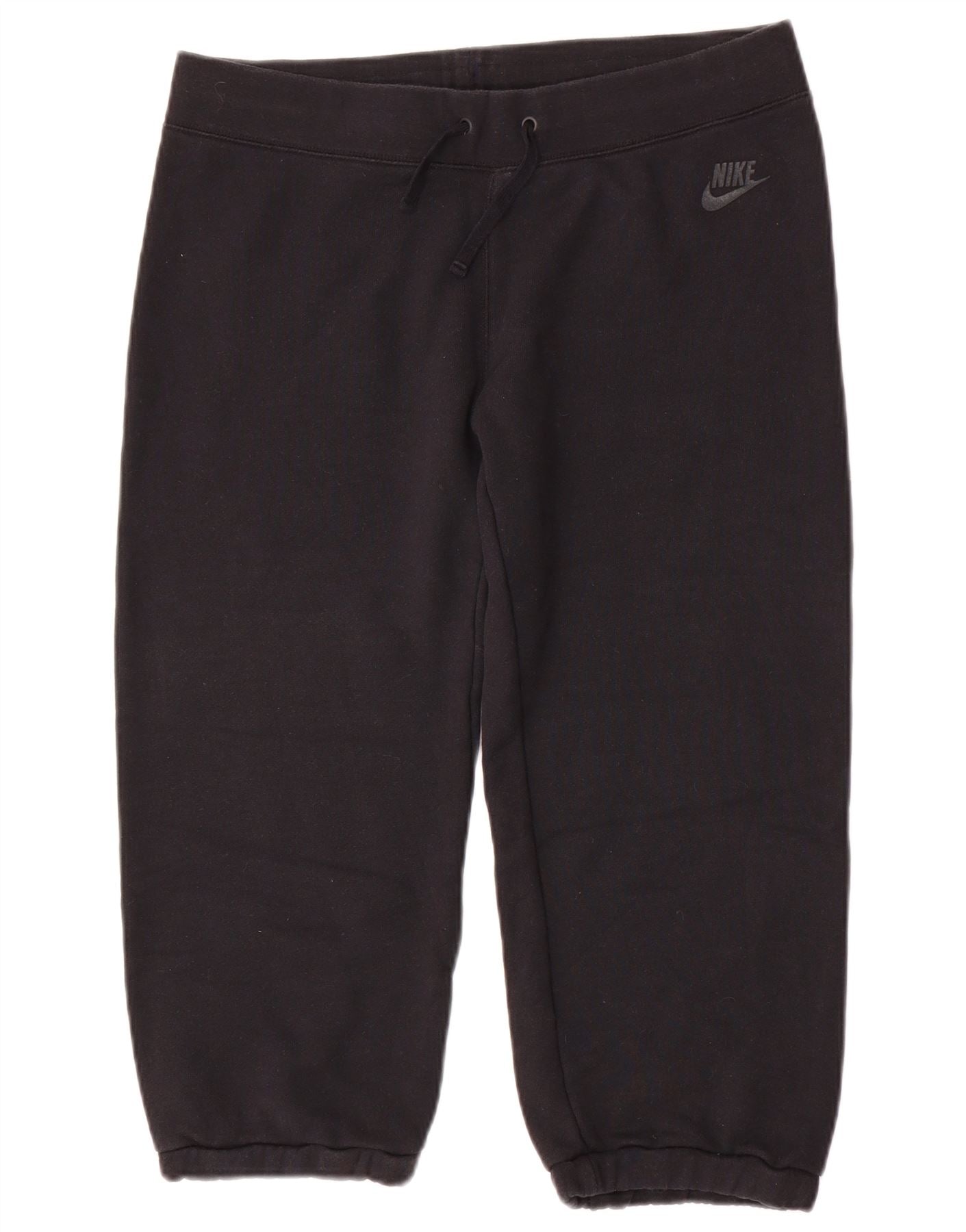 - AI Description: This Nike womens tracksuit trousers are crafted from soft black cotton knit fabric, featuring a comfortable fleece interior. They offer a regular fit with a practical drawstring and elasticated waist for ease. The capri length provides a modern, athletic silhouette. Convenient pockets enhance functionality. A subtle brand logo adds a signature athletic touch, perfect for running or casual wear.