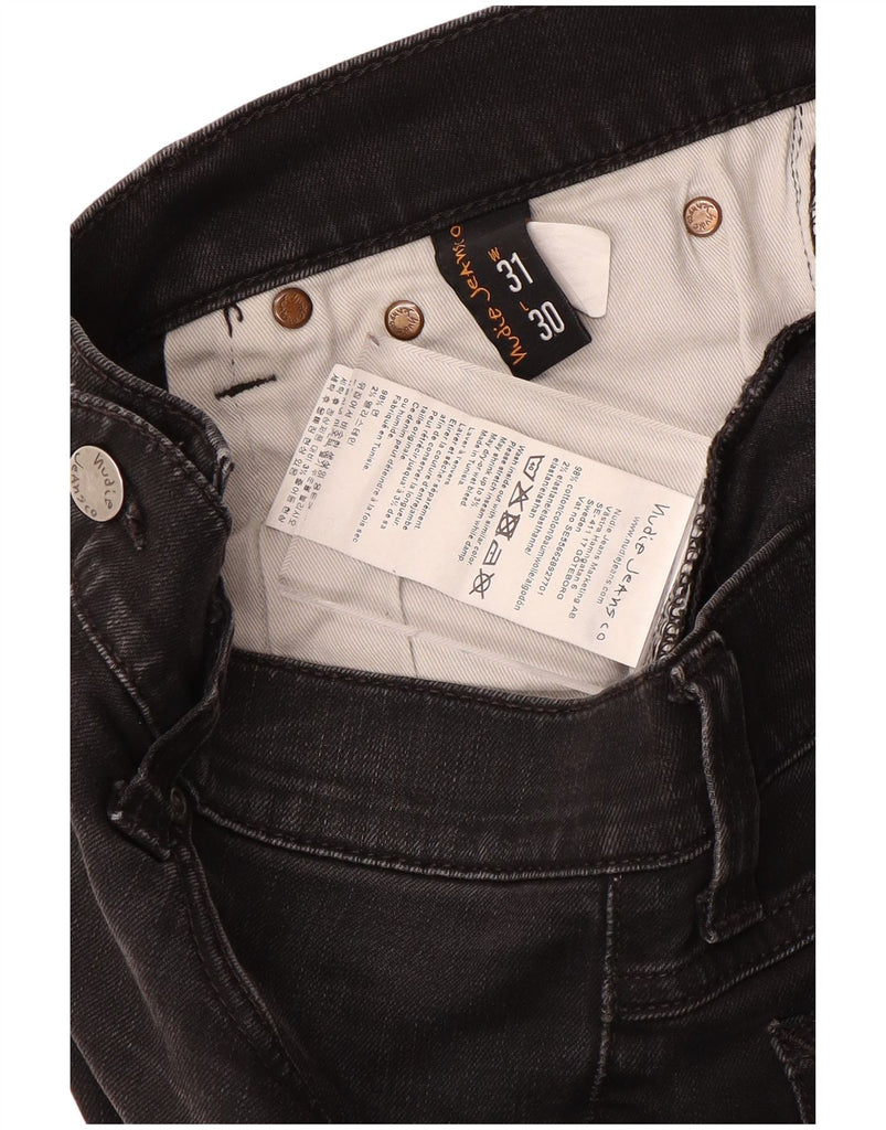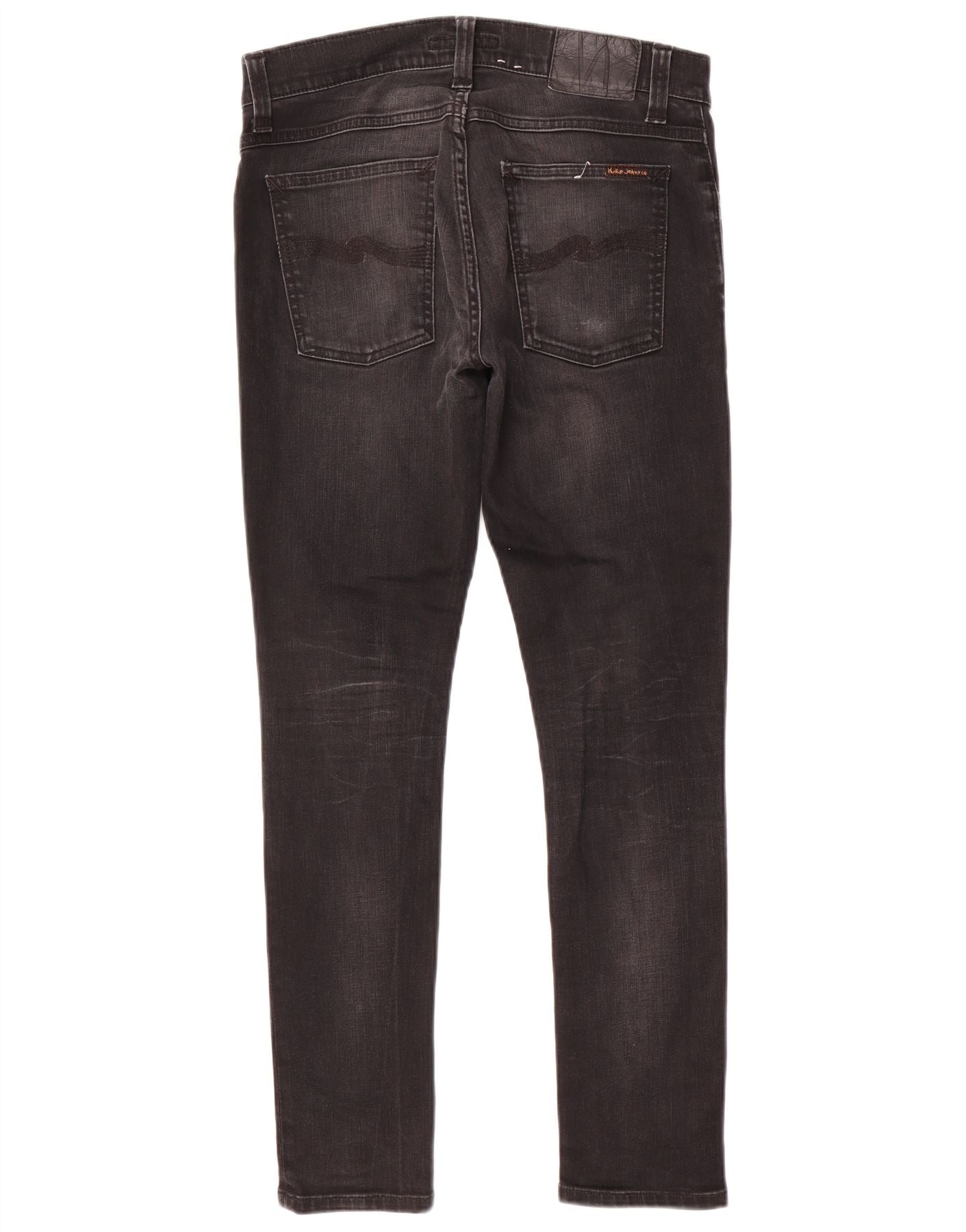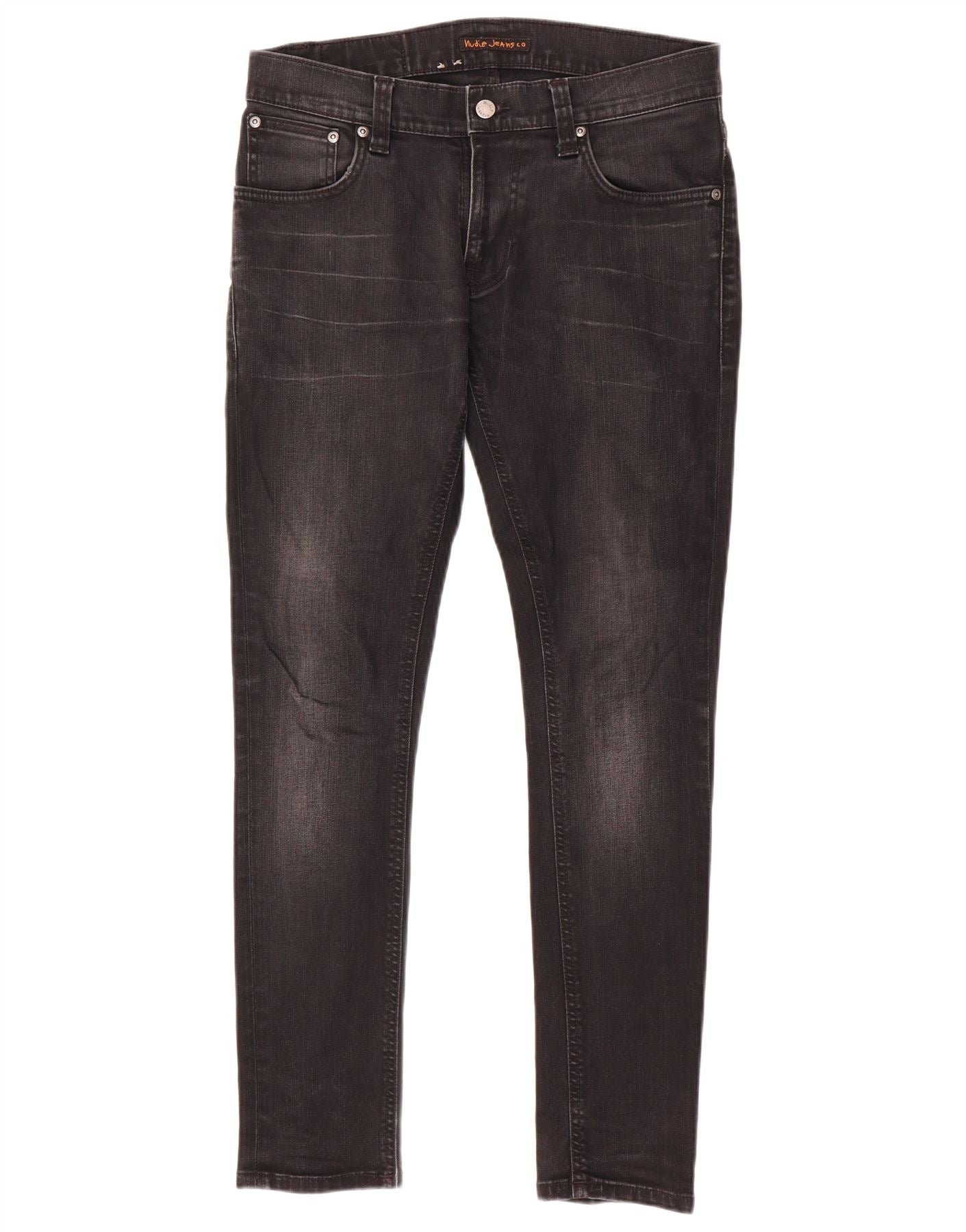- AI Description: These Nudie Jeans mens slim jeans are crafted from black stretch denim, offering both comfort and a sleek appearance. The 99 cotton and 1 elastane blend ensures a soft feel. They feature a classic button closure and a slim fit through the leg. This design provides a modern silhouette. Practical pockets complete the functional yet stylish look, making them ideal for everyday wear.