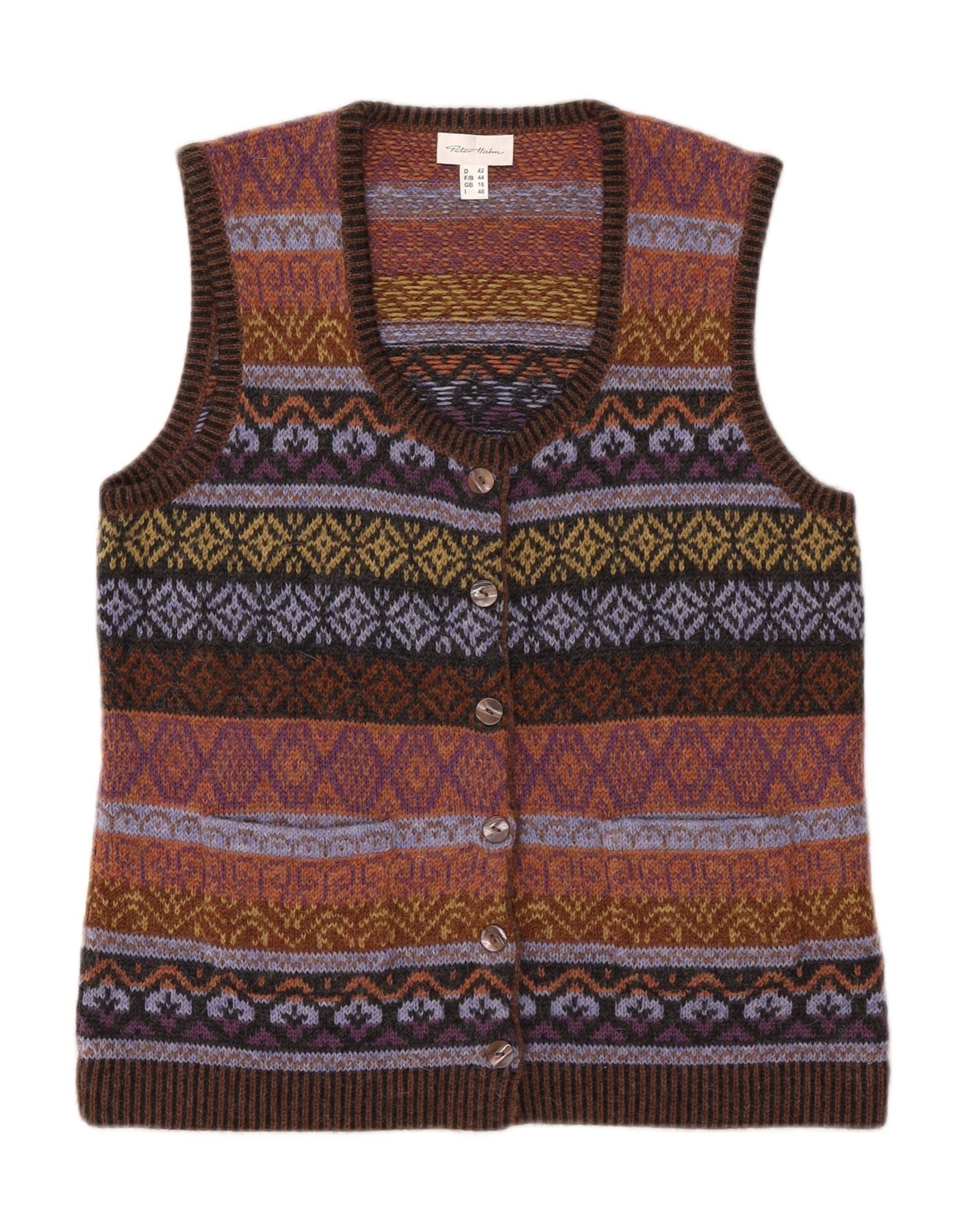 PETER HAHN Damski sweter rozpinany bez rękawów UK 16 Large Brown Fair Isle