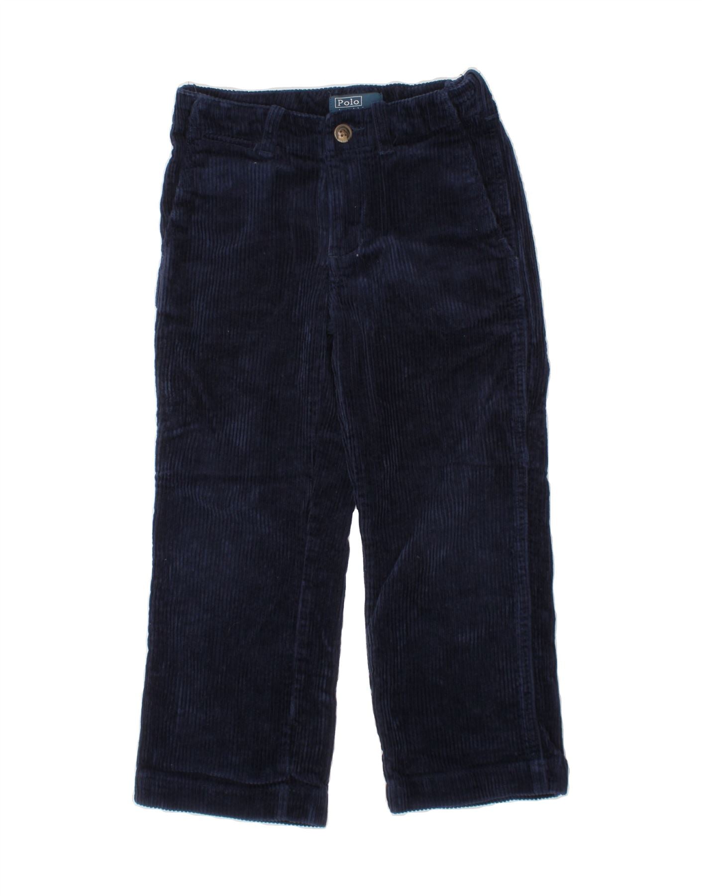 - AI Description: These pre-owned Polo Ralph Lauren boy's corduroy trousers are in excellent condition. Crafted from 100% cotton in a versatile navy blue, they feature a comfortable regular fit and button closure. The classic corduroy fabric adds texture, while practical pockets enhance functionality. Minor signs of wear are present overall and on the waistband. Label size 4. Machine washable.