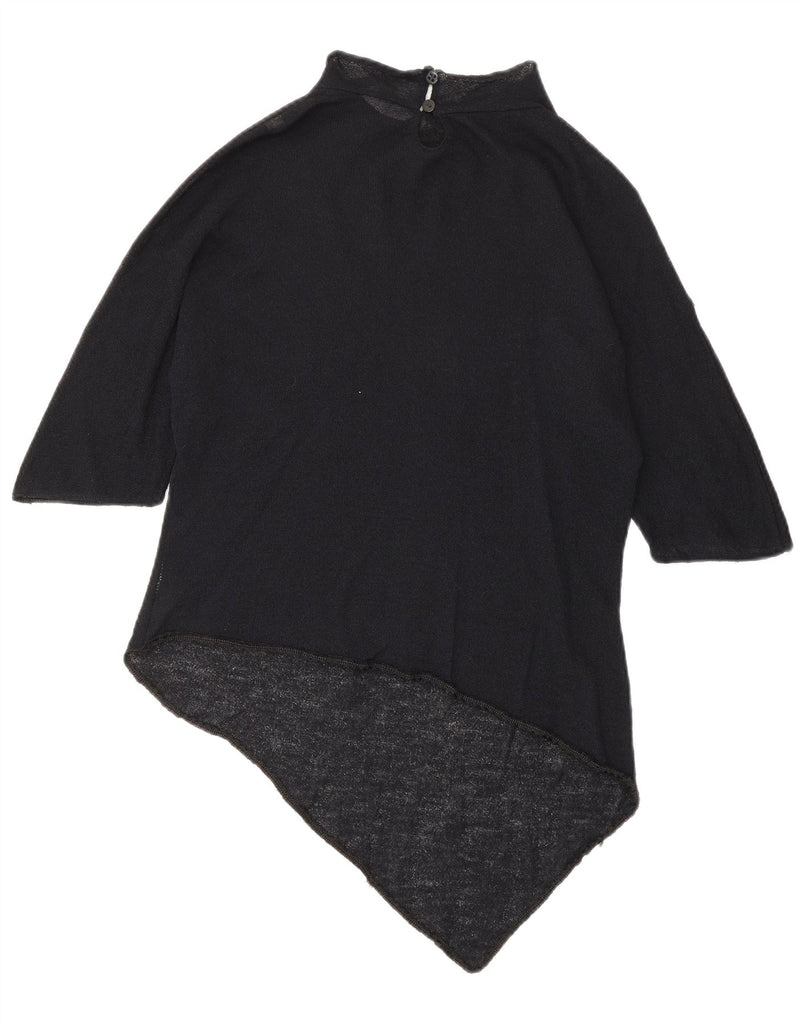 - AI Description: This Roberto Cavalli womens sweater is crafted from a luxurious black knit fabric. It features a chic mock neck and practical zip closure. The relaxed fit and 3/4 sleeves offer comfortable wear. An asymmetric hemline adds a modern, distinctive silhouette. Subtle sequin accents provide a touch of sophisticated sparkle, elevating this designer piece. Its unique cut ensures a contemporary and stylish look.