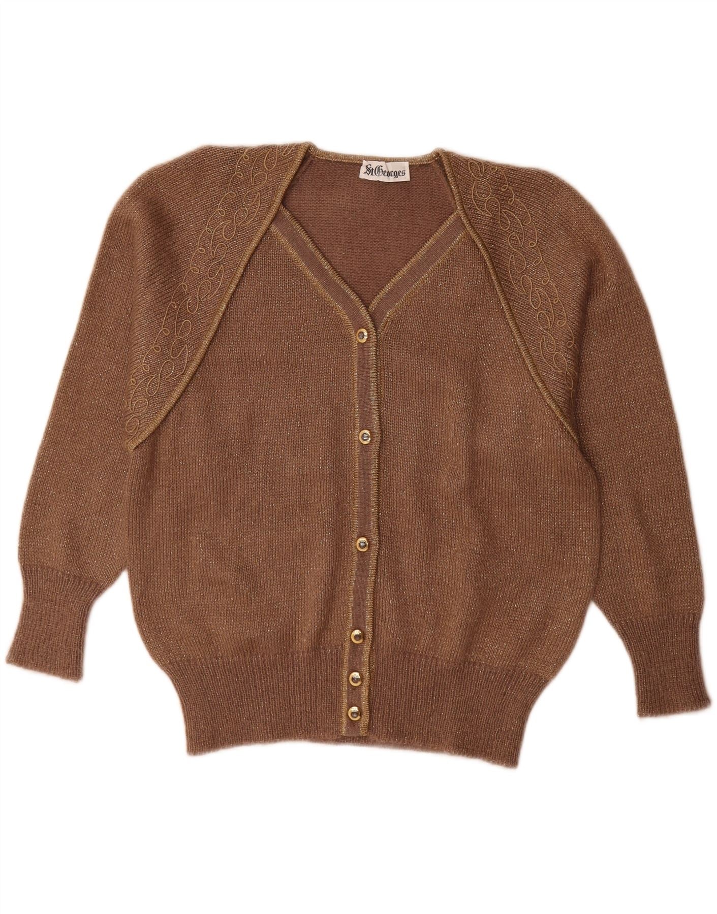 - Opis sztucznej inteligencji: Ten damski sweter rozpinany St Georges jest wykonany z luksusowej dzianiny z domieszką moheru i ma miękką, puszystą fakturę w bogatym brązie. Całość przepleciona jest subtelną złotą nitką, która dodaje delikatnego połysku. Ma klasyczny dekolt w kształcie litery V i przód zapinany na guziki w złotym kolorze. Długie rękawy zakończone wygodnym ściągaczem w nadgarstkach. Regularny krój zapewnia wygodę noszenia. Delikatne tkane detale zdobią ramiona, podkreślając jej retro urok.