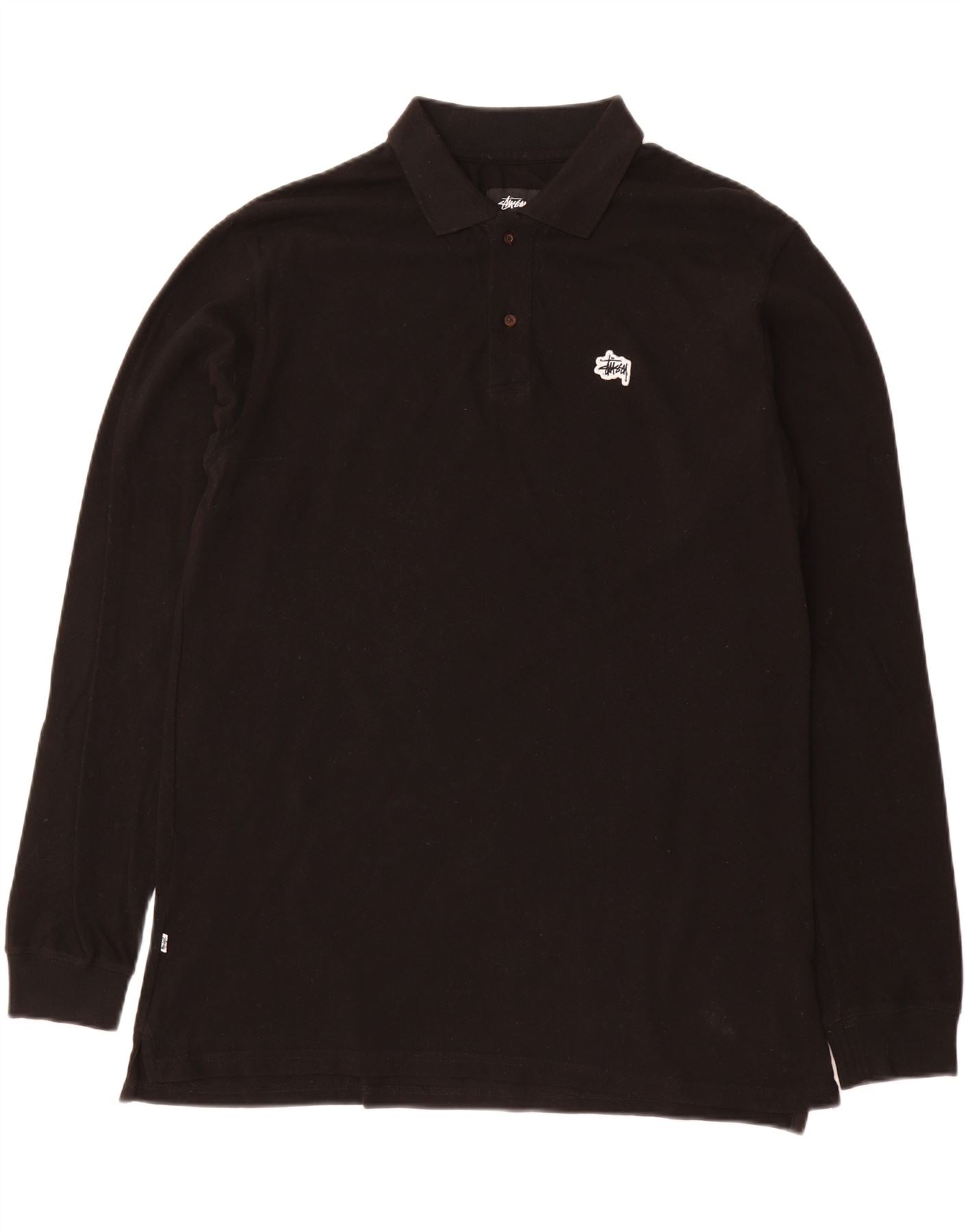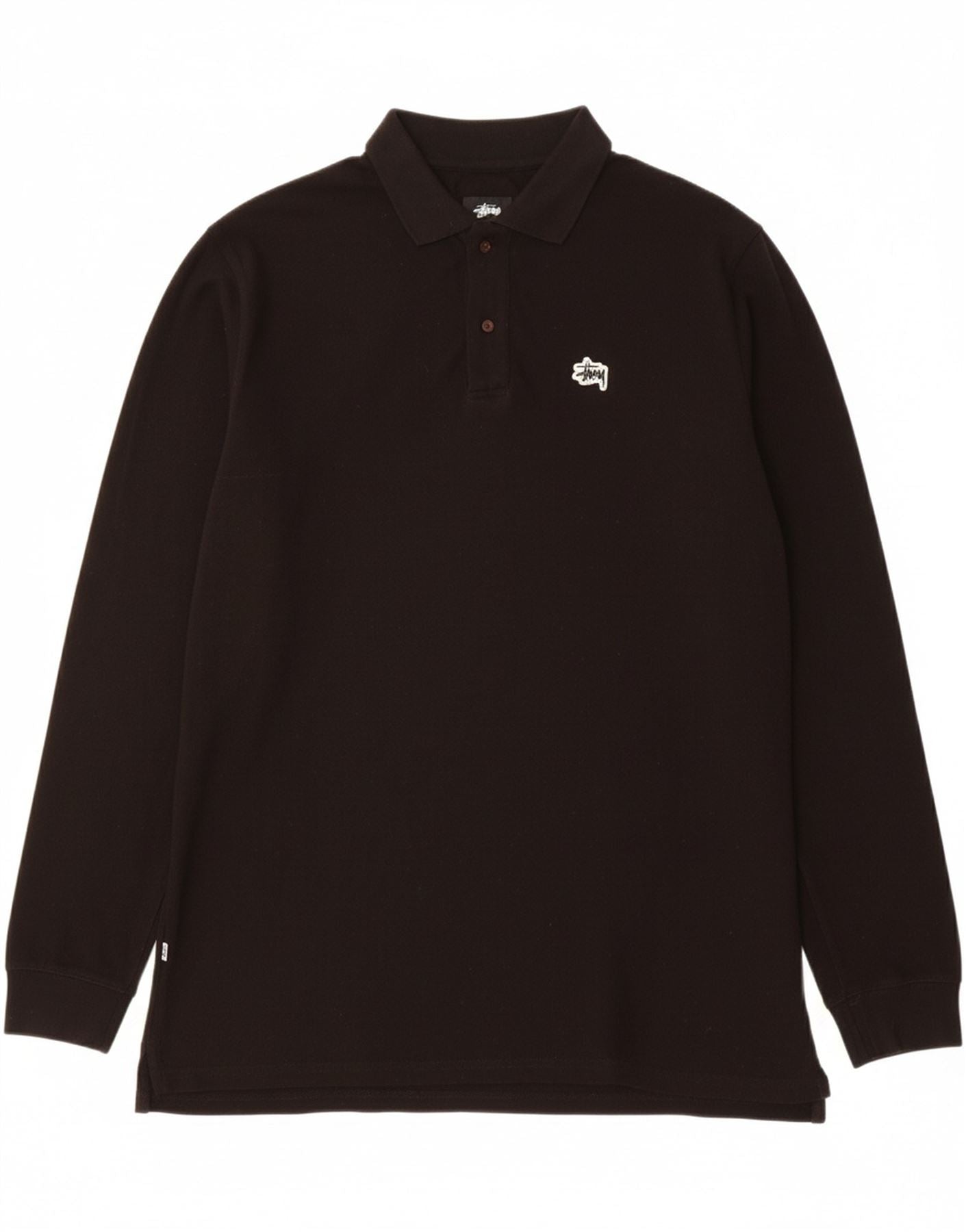 - AI Description: This Stussy men's Polo Shirt is crafted from soft black cotton jersey. It features a classic collared neckline and long sleeves. A button-up placket provides traditional detailing. The regular fit ensures a comfortable, relaxed silhouette. A subtle embroidered logo adds a signature touch. This modern style offers a clean, versatile look suitable for various occasions. It combines classic design with quality material for enduring wear.