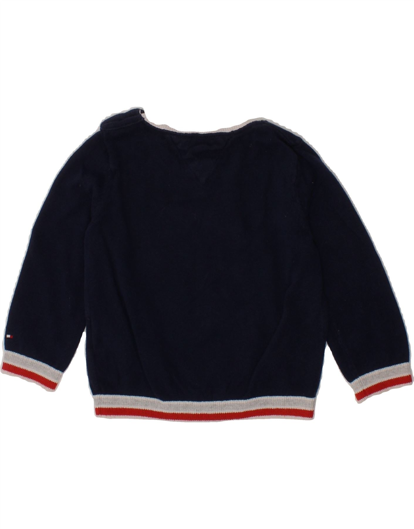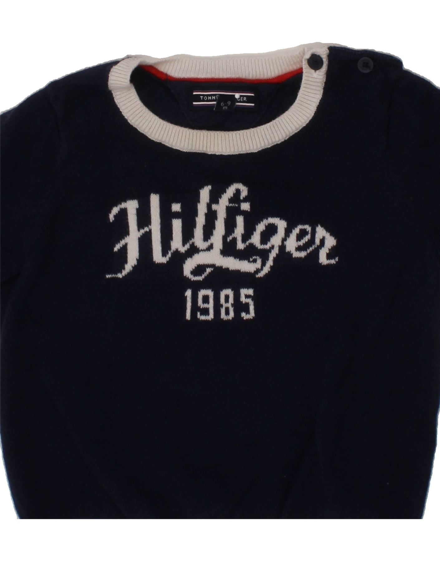 - AI Description: Tommy Hilfiger baby boy's navy blue knitted sweater in excellent pre-owned condition. This classic round neck jumper features a regular fit, long sleeves and a pullover closure. The knit fabric showcases a graphic design and a logo accent. There are minor instances of loose stitching on the front, back and collar.