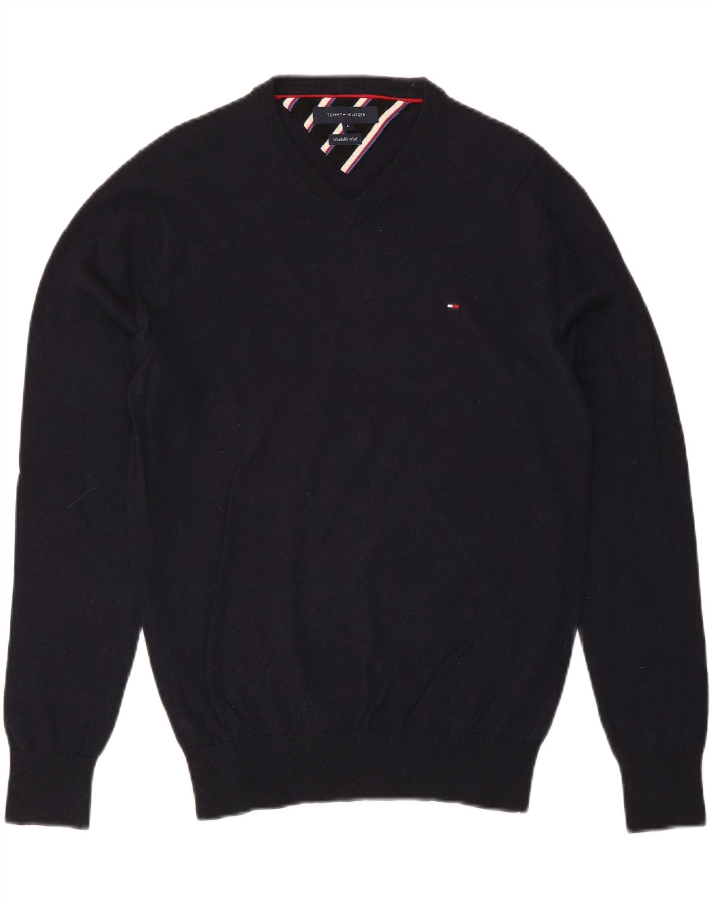 TOMMY HILFIGER Męski sweter z dekoltem w kształcie litery V, duży, granatowy, wełniany