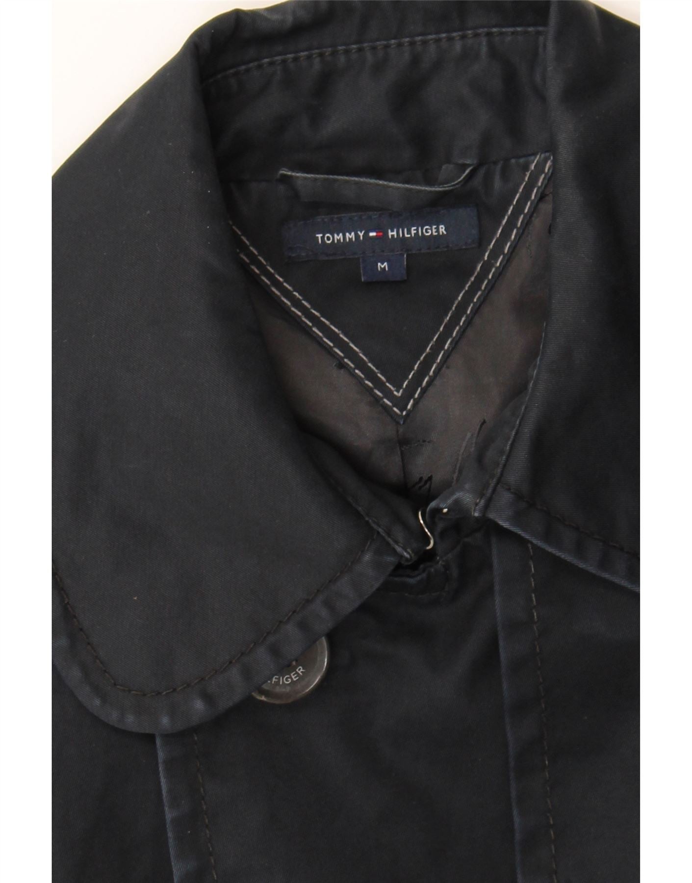 - AI Description: This pre-owned Tommy Hilfiger trench coat is a timeless classic. Crafted from a woven blend of polyester, cotton, nylon, and spandex, this black, double-breasted coat features a regular fit, long sleeves, and a collared neckline. Accented with buttons and a belted waist, it also includes practical pockets. A stylish and versatile addition to any wardrobe.