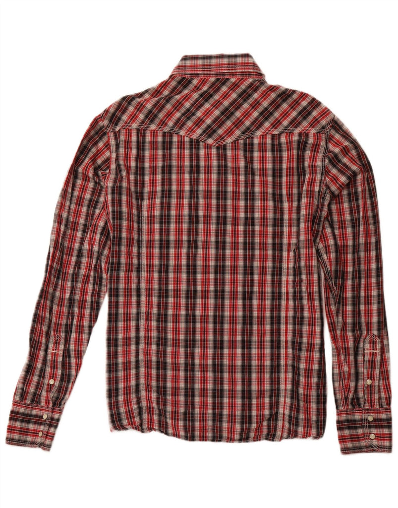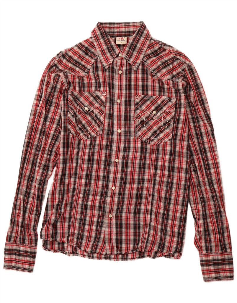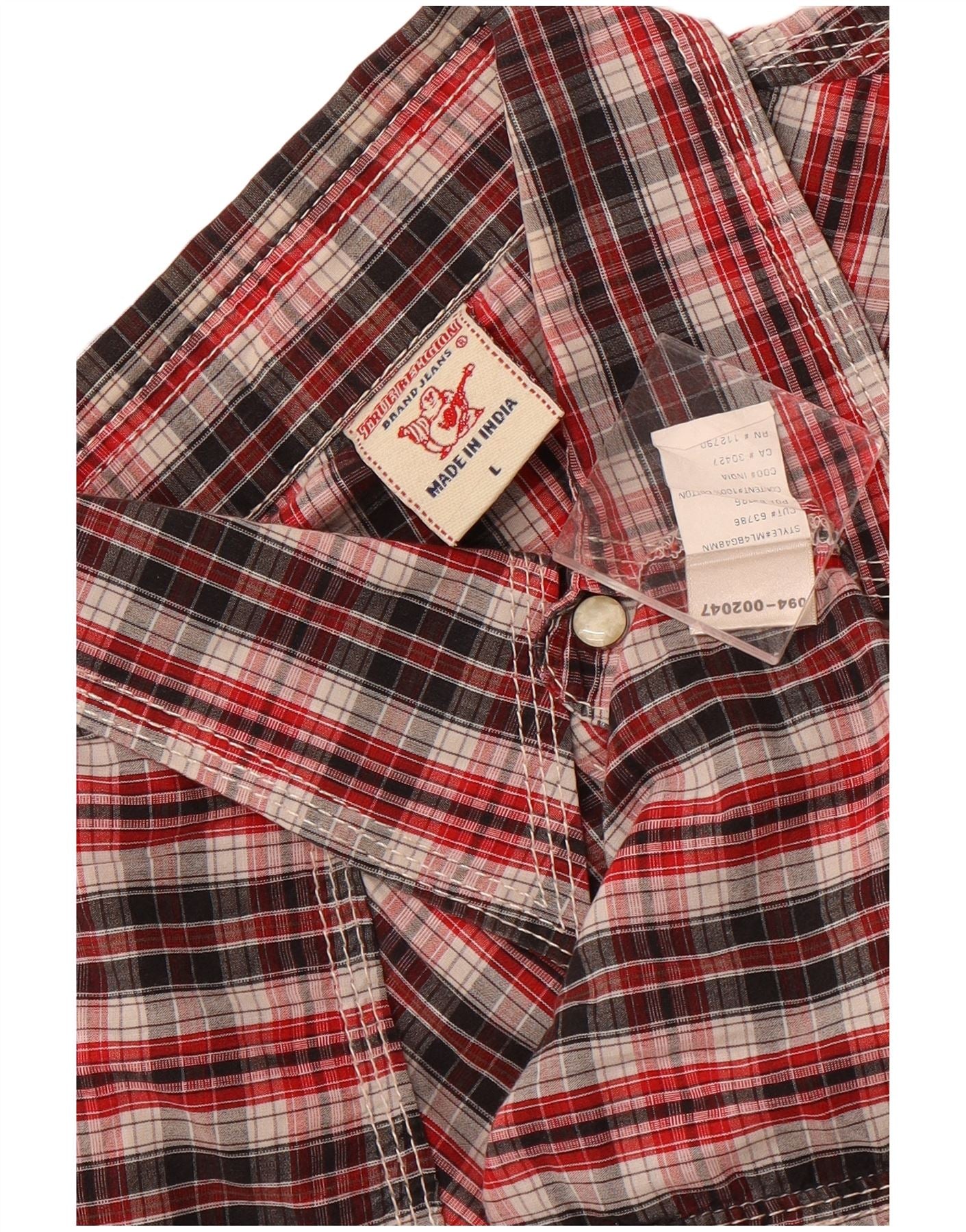 - AI Description: This True Religion mens shirt is crafted from a woven fabric, offering a robust feel. It features a striking multicoloured plaid pattern, incorporating red, black, and white tones. The collared neckline and long sleeves define its classic silhouette. A button-up front ensures a secure closure. Designed in a regular fit, it offers comfortable wear. Western styling is evident, complete with practical pockets and button accents.