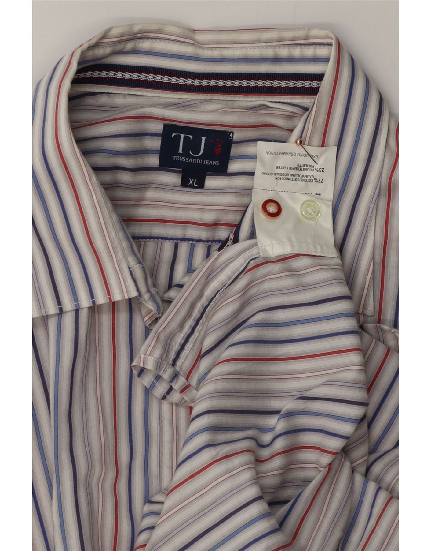 - Opis sztucznej inteligencji: Ta koszula męska Trussardi Jeans jest wykonana z wygodnej tkaniny z domieszką bawełny. Ma klasyczny dekolt z kołnierzykiem i przód zapinany na guziki. Wielokolorowy wzór w paski w kolorze czerwonym, niebieskim i szarym zapewnia elegancką, swobodną estetykę. Długie rękawy zakończone mankietami zapinanymi na guziki dopełniają całości. Regularny krój zapewnia wygodną i wszechstronną sylwetkę.