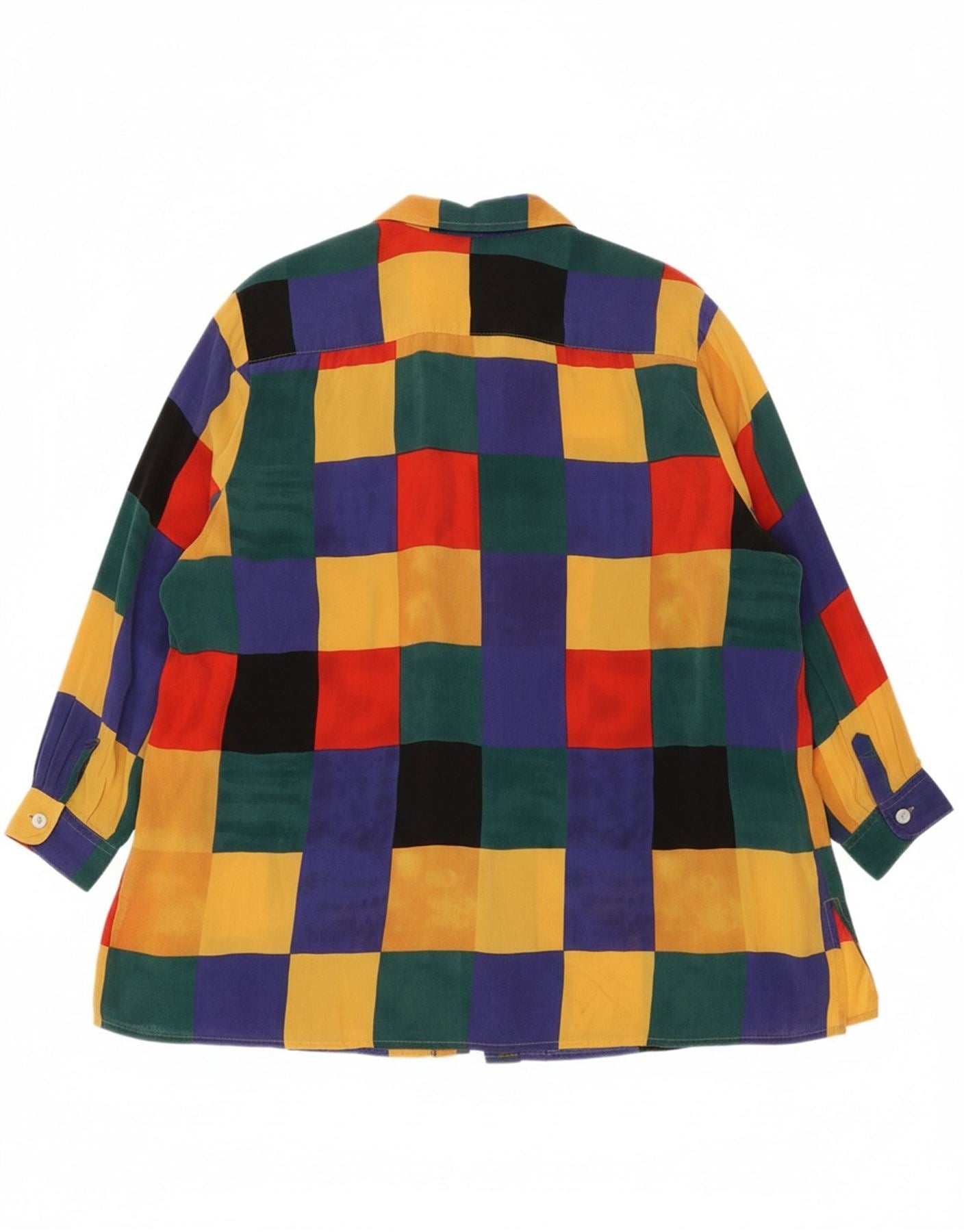 - AI Description: This Ulla Popken women’s shirt blouse is crafted from soft, flowing 100% Cupro for a luxurious, silken feel. It features a classic collared neckline and a full button-up front. The design includes comfortable 3/4 sleeves and a loose, relaxed fit. A vibrant, multicoloured geometrical check pattern adorns the fabric, creating a striking visual interest. This retro-style blouse offers both elegance and ease, perfect for a sophisticated casual look.