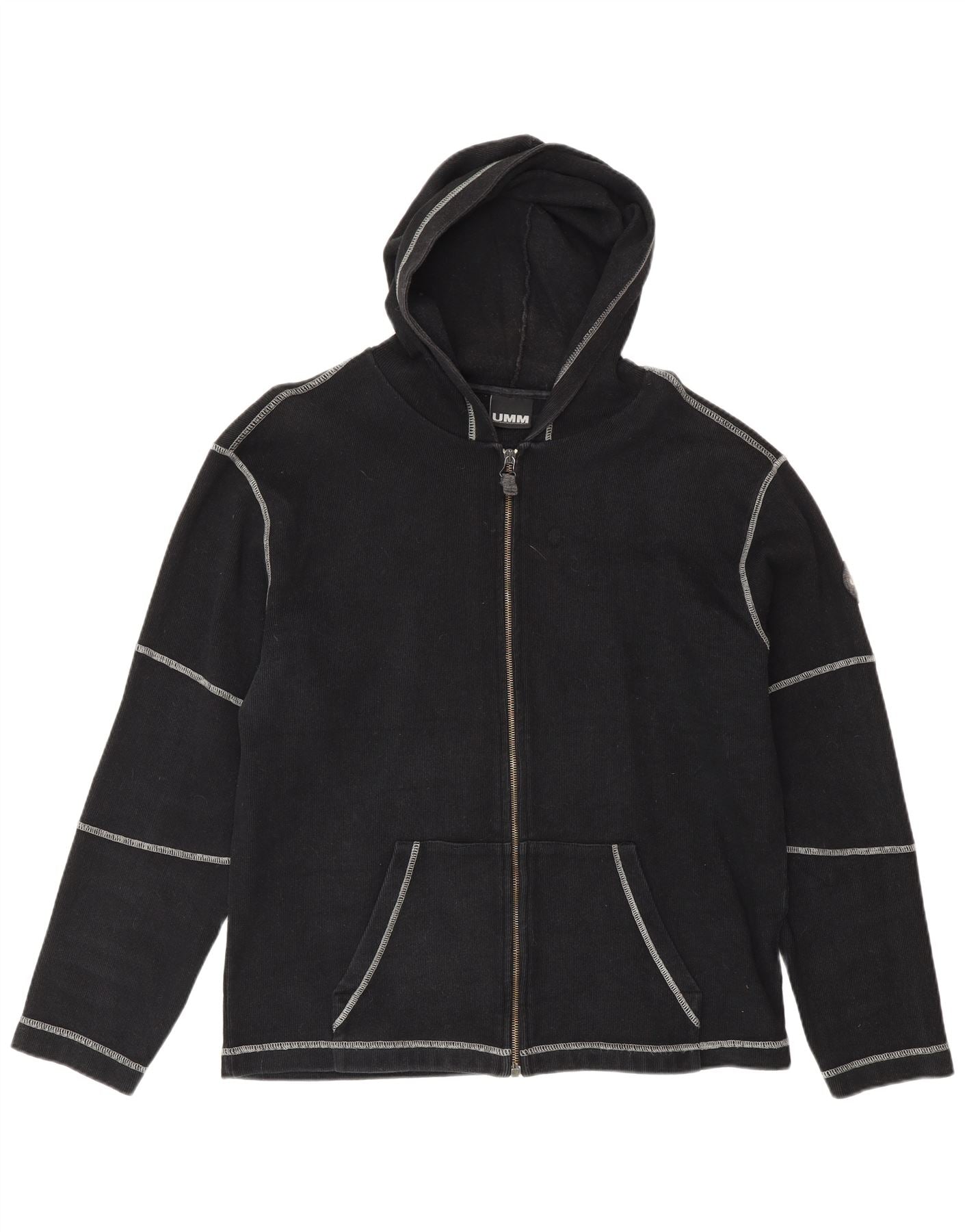 - Opis sztucznej inteligencji: Ten męski sweter z kapturem i zamkiem błyskawicznym UMM jest wykonany w 100% z czarnej dzianiny bawełnianej. Posiada pełny zamek błyskawiczny i wygodny kaptur. Długie rękawy i regularny krój zapewniają wygodę noszenia. Wyraźne białe geometryczne szwy tworzą charakterystyczny wzór wizualny. Dwie przednie kieszenie dodają praktycznych detali. Wyszywane logo UMM subtelnie podkreśla markę odzieży.