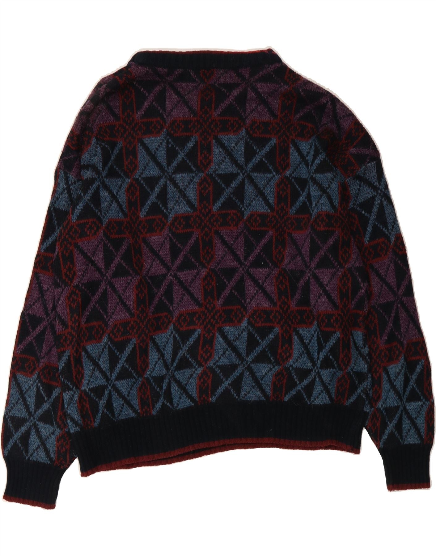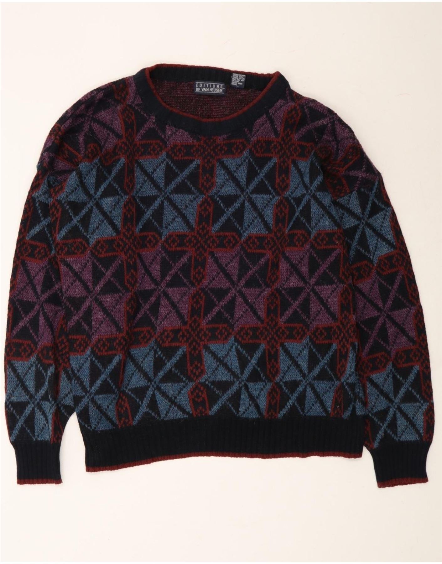 - AI Description: This pre-owned Van Heusen crew neck jumper sweater offers a stylish nod to 90s fashion. Crafted from a knitted, multicoloured acrylic blend (95% Acrylic, 5% Nylon), this geometric patterned pullover features long sleeves and a regular fit. The round neckline and 'CARE ON REVERSE' washing instructions add practicality. In excellent condition, this XL jumper, made in Korea, also has a button accent.