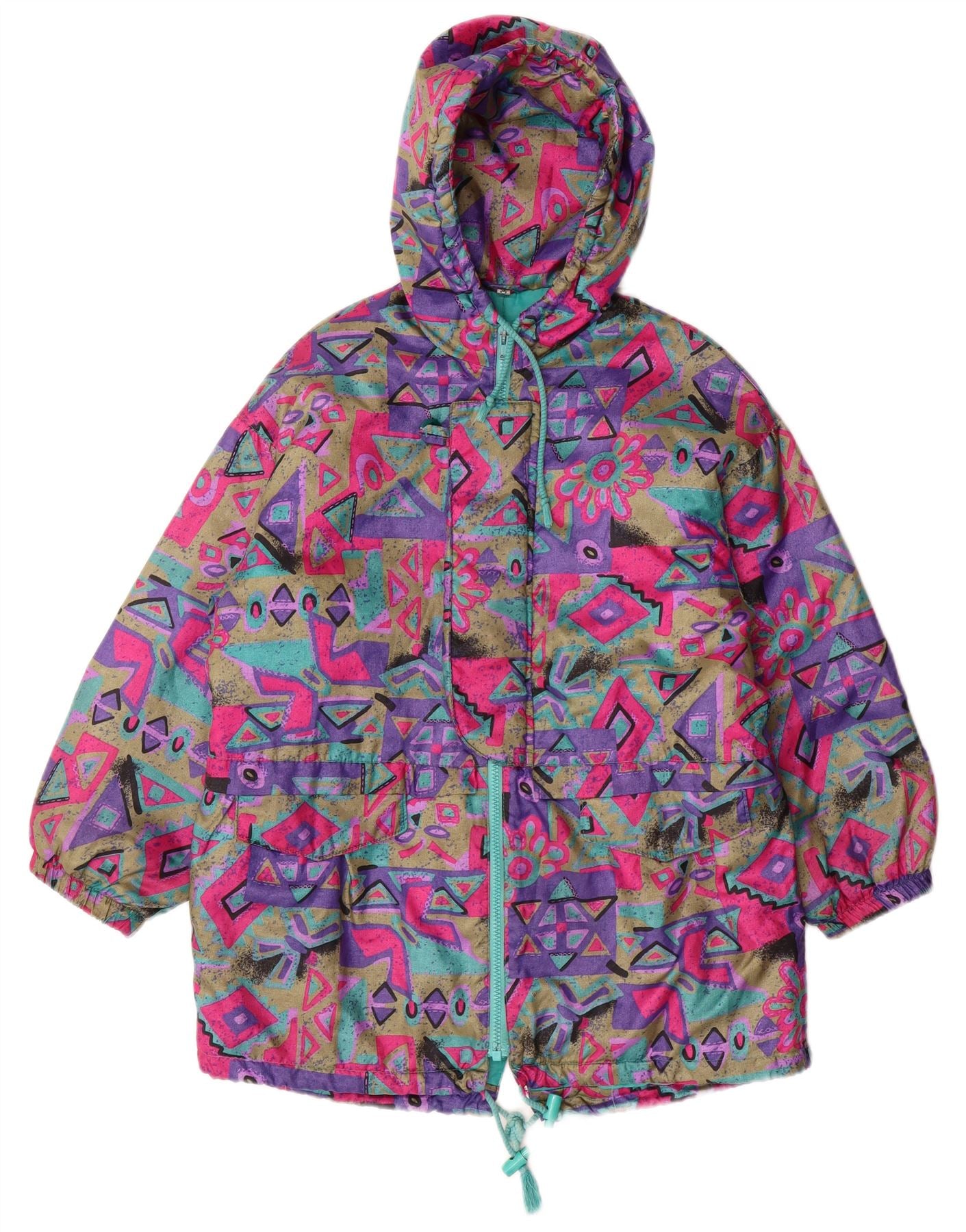 Dziewczęcy płaszcz wiatrówka z kapturem VINTAGE 15-16 lat, wielokolorowy, geometryczny