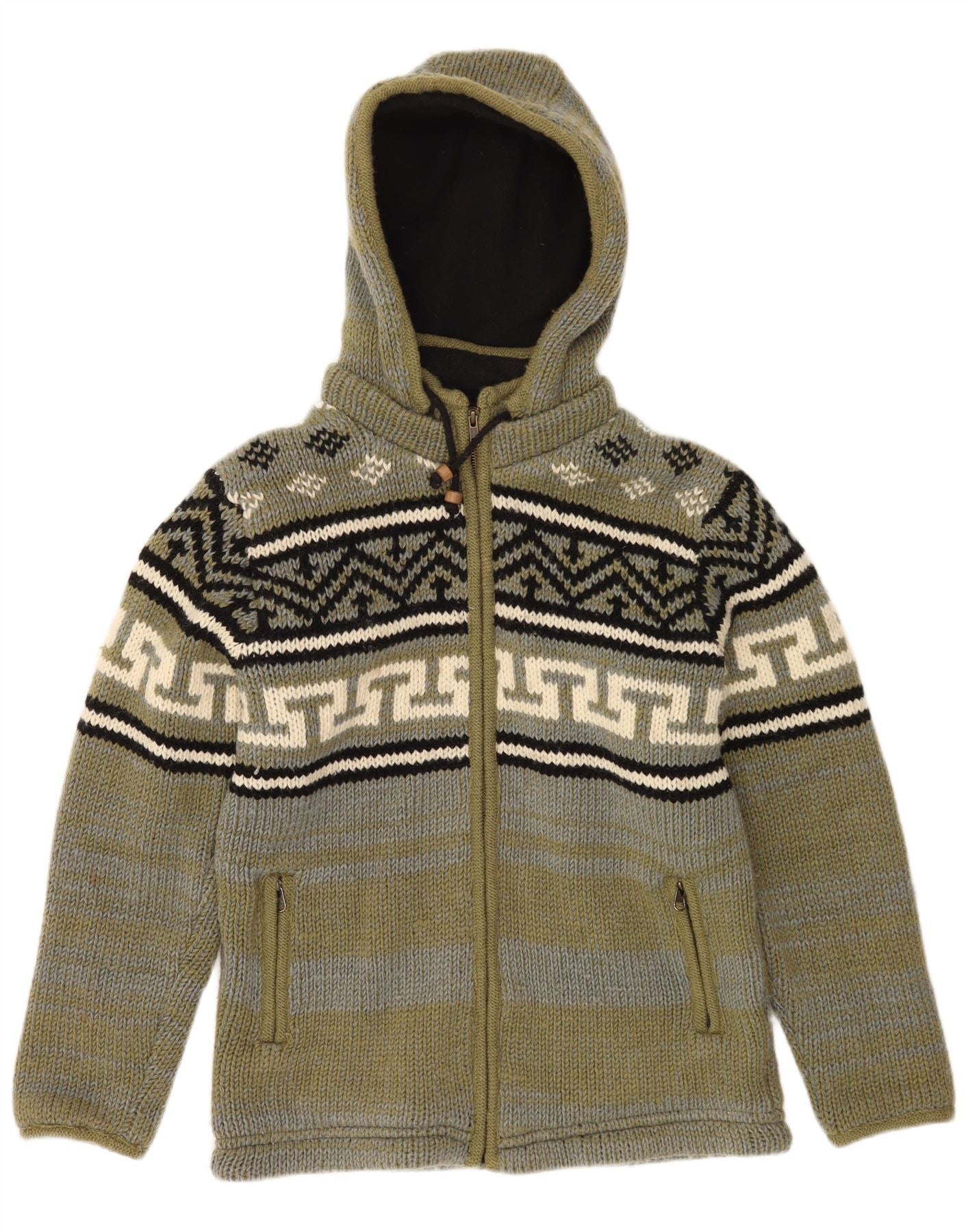Męski sweter rozpinany z kapturem w stylu VINTAGE, średni khaki, wełna Fair Isle
