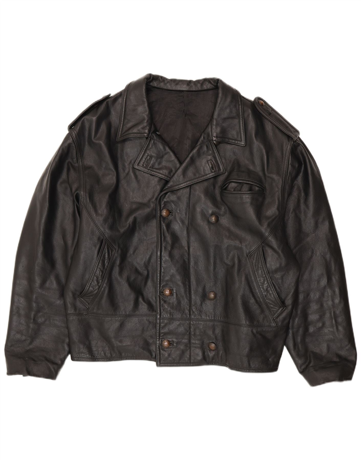 VINTAGE Mens Military Double Breasted Leather Jacket UK 42 XL Black