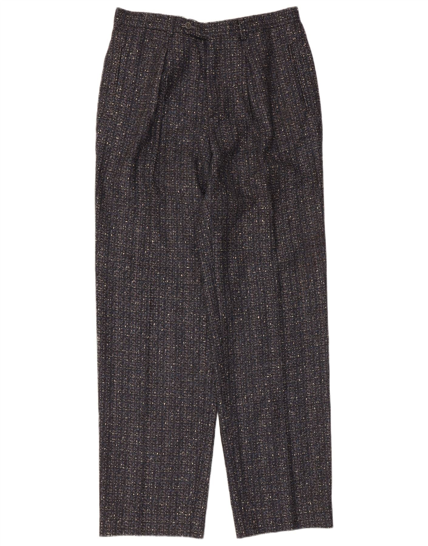 - Opis sztucznej inteligencji: Te męskie spodnie w stylu vintage są wykonane z bogatej mieszanki wełny i mają teksturowane, nakrapiane wykończenie. Wielobarwny materiał charakteryzuje się subtelnymi plamkami czerni, granatu i szarości. Mają klasyczny plisowany przód i bezpieczne zapięcie na zamek błyskawiczny. Regularny krój i proste nogawki zapewniają wygodną, ponadczasową sylwetkę. Praktyczne kieszenie uzupełniają projekt, łącząc funkcjonalność z klasycznym stylem.