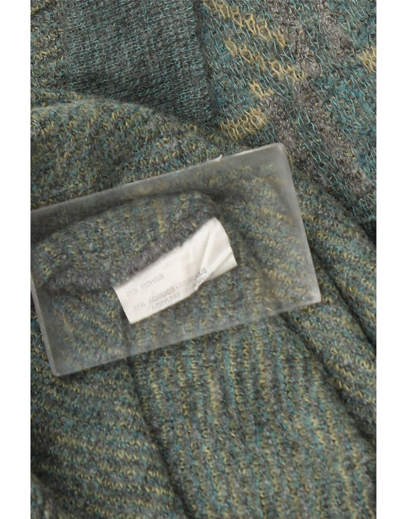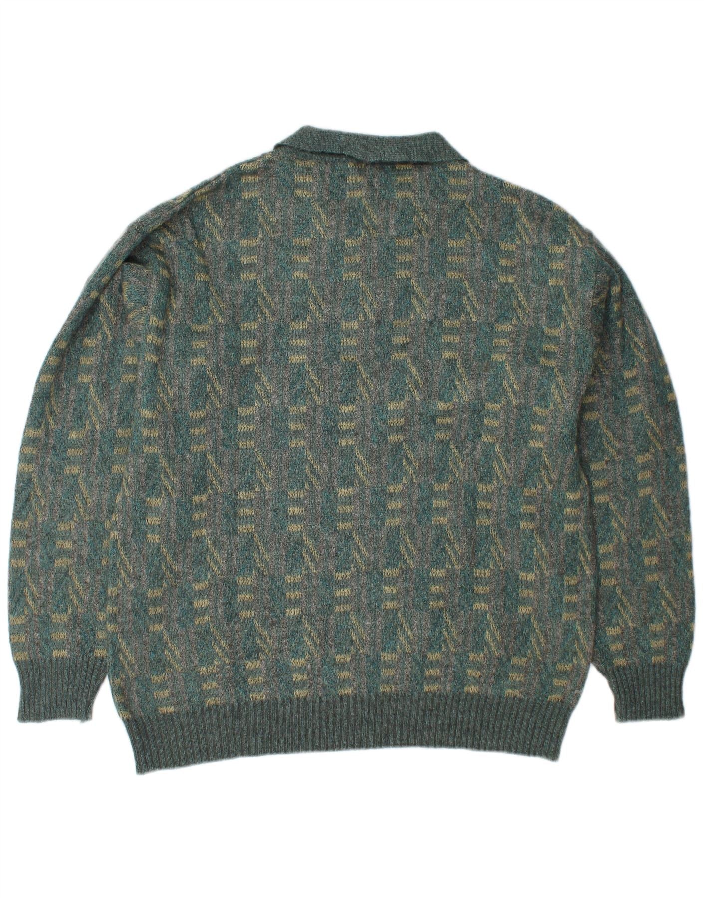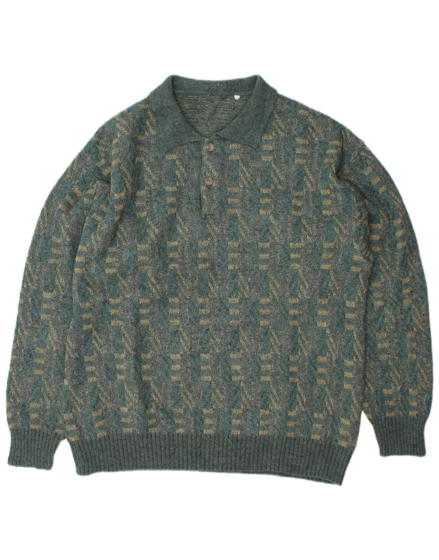 Męski sweter VINTAGE z dekoltem w serek polo, duże, zielone, moherowe paski