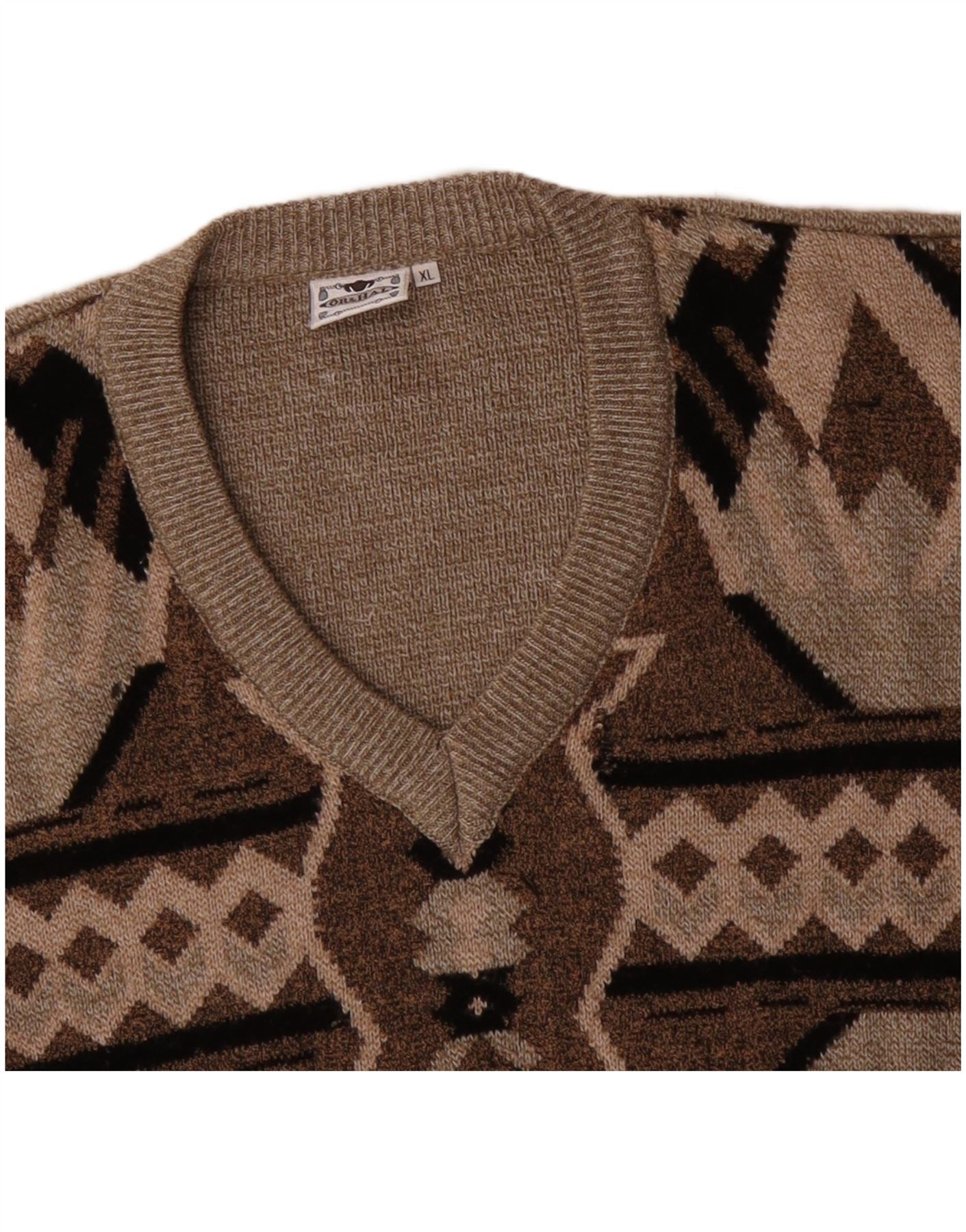 VINTAGE Męski sweter z dekoltem w kształcie litery V, XL, brązowy, geometryczny