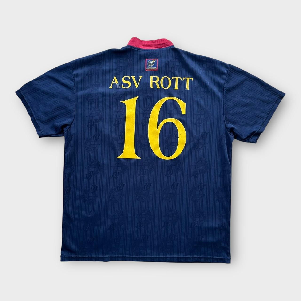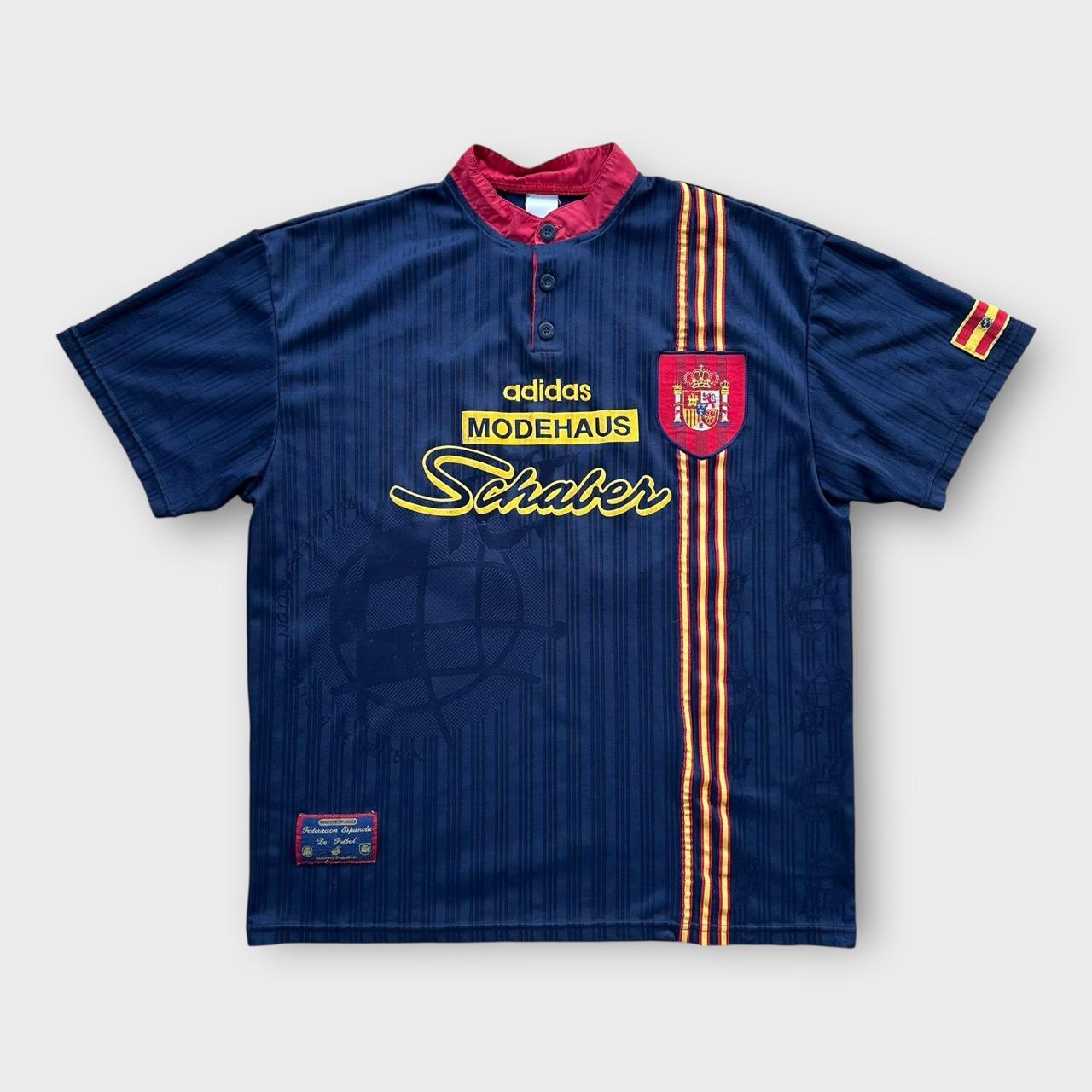 Klasyczna wyjazdowa koszulka piłkarska Hiszpanii z 1996 roku marki Adidas w kolorze granatowym z 3 paskami na piersi i haftowanym logo. Zawiera również sponsoring strony trzeciej i numer na odwrocie