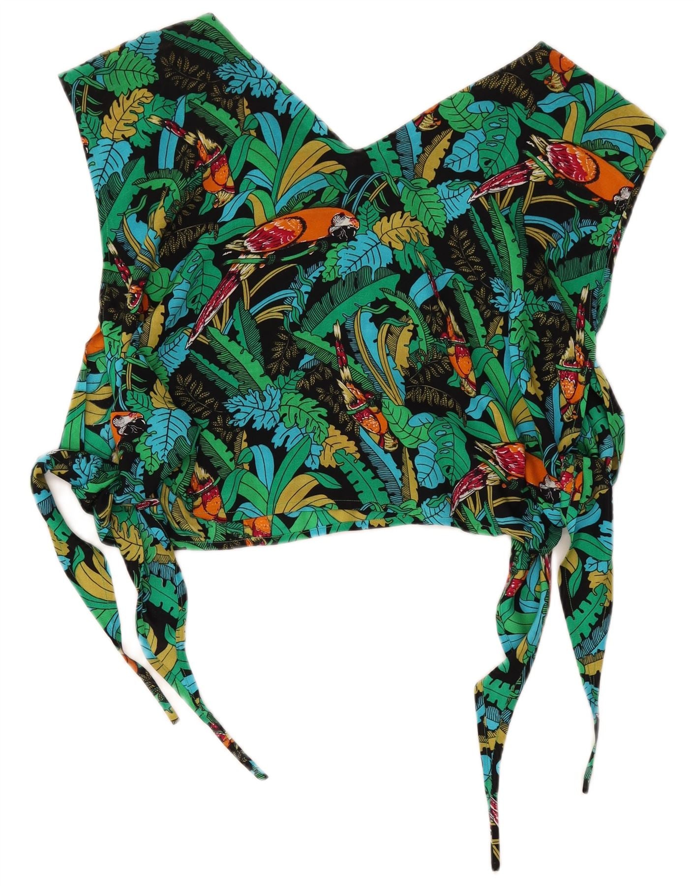 - Opis sztucznej inteligencji: Ten damski krótki top w stylu vintage jest wykonany z lekkiej tkaniny z żywym, wielobarwnym tropikalnym wzorem kwiatowym. Charakteryzuje się efektownym dekoltem w kształcie litery V i fasonem bez rękawów. Zawijany styl zapewnia swobodny krój i jest zabezpieczony wiązaniem. Krótka długość dodaje nowoczesnego, stylowego charakteru, idealnego do festiwalowego wyglądu.
