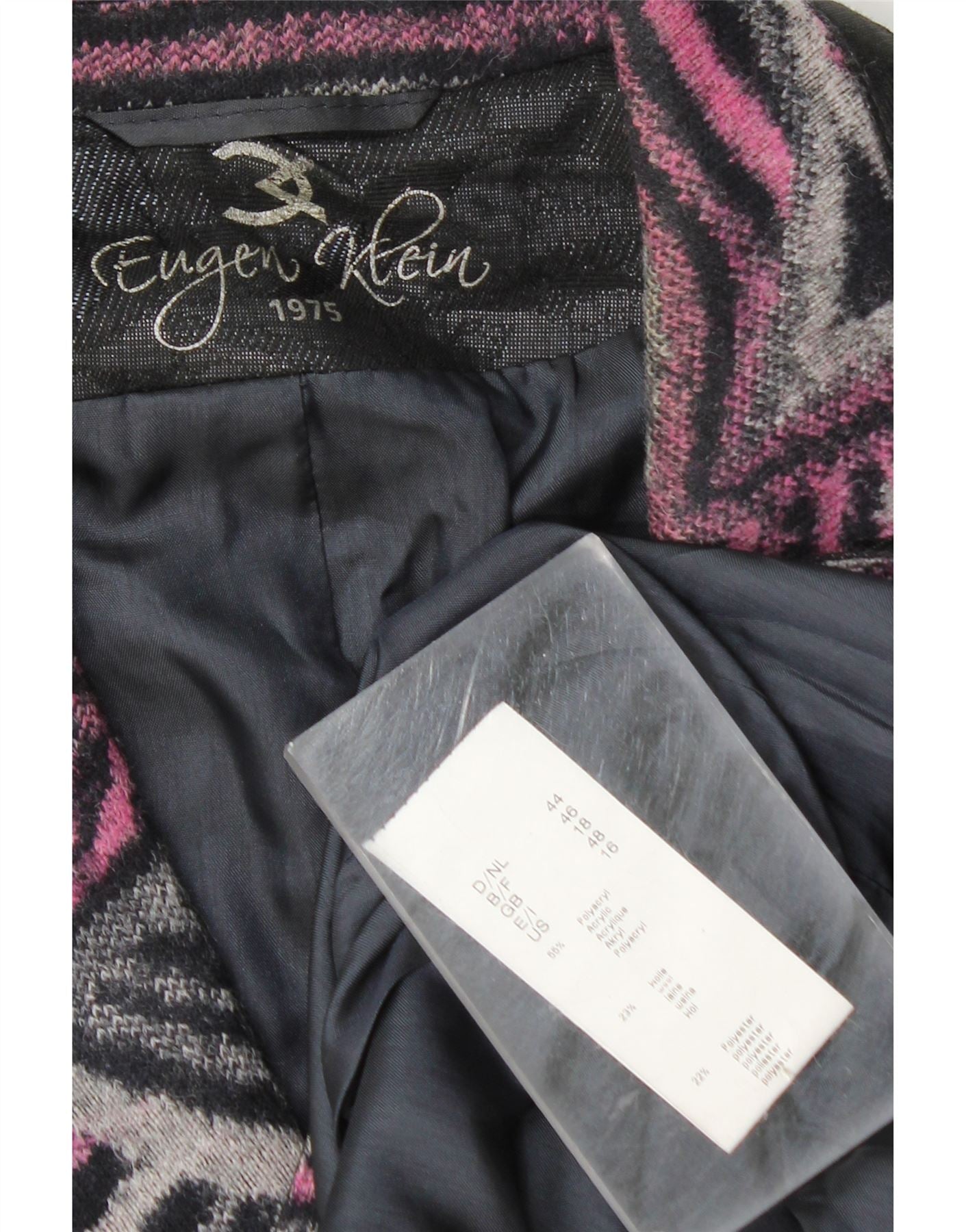 - Opis sztucznej inteligencji: Ta damska kurtka Eugen Klein jest wykonana z mieszanki tkanin z efektownym, wielobarwnym wzorem geometrycznym. Dzianinowa faktura łączy w sobie odcienie różu, czerni i szarości, nadając jej charakter retro. Posiada klasyczny dekolt z kołnierzykiem i długie rękawy. Zapinana z przodu na jeden guzik, uzupełniona subtelnymi kieszeniami. Kurtka jest w pełni podszyta, co zapewnia wygodne i strukturalne, regularne dopasowanie.