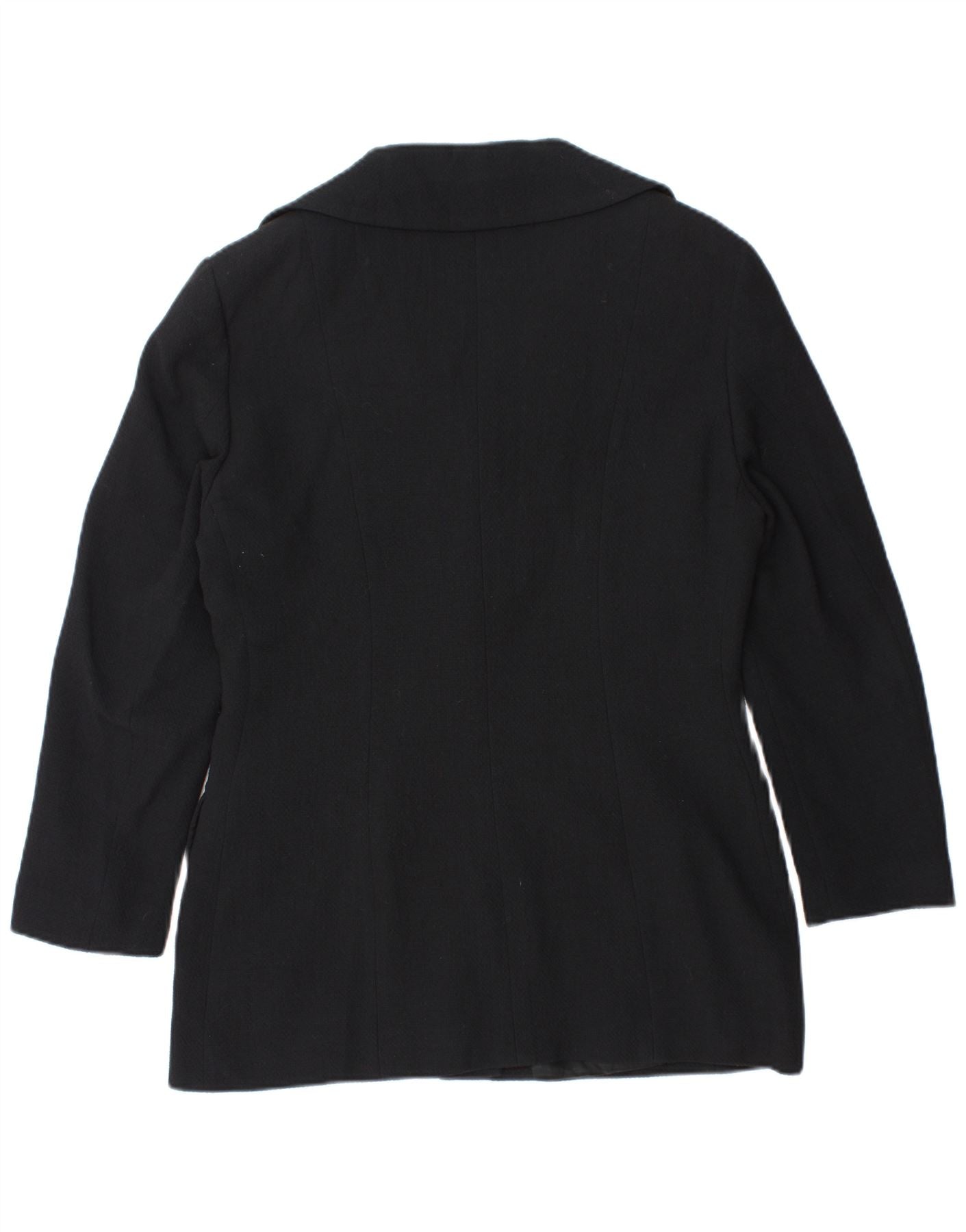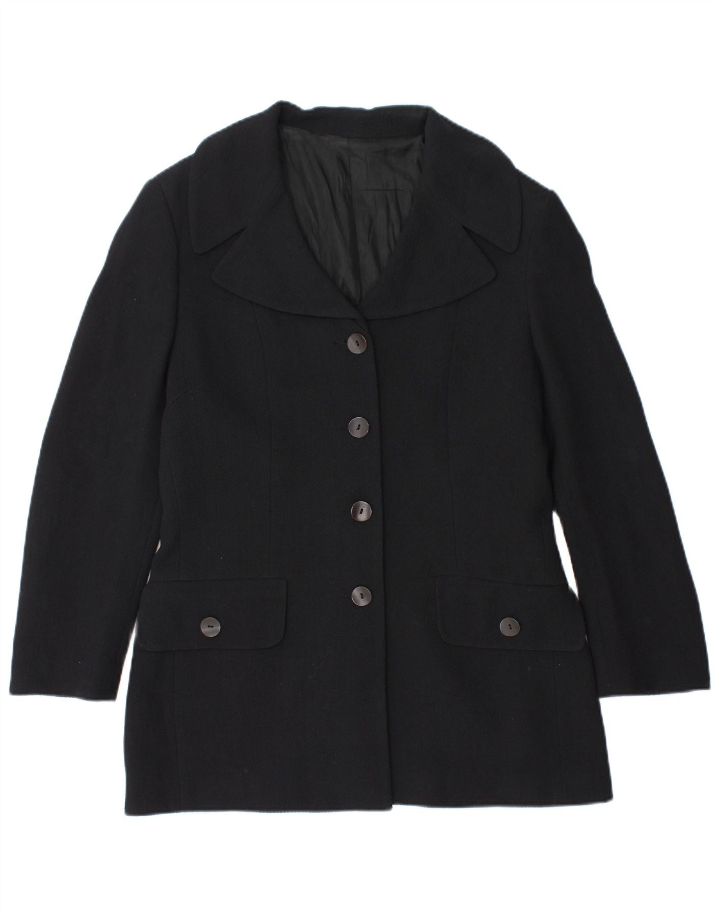 - Opis sztucznej inteligencji: Ta damska kurtka w stylu vintage jest wykonana z bogatej mieszanki czarnej wełny o wyrafinowanej tkanej fakturze. Posiada klasyczny dekolt z kołnierzykiem i długie rękawy. Regularny krój zapewnia wygodę noszenia. Zapięcie z przodu na cztery guziki i dwie przednie kieszenie stanowią praktyczne i stylowe detale. Jest w pełni wyłożony, co zapewnia gładkie wykończenie.