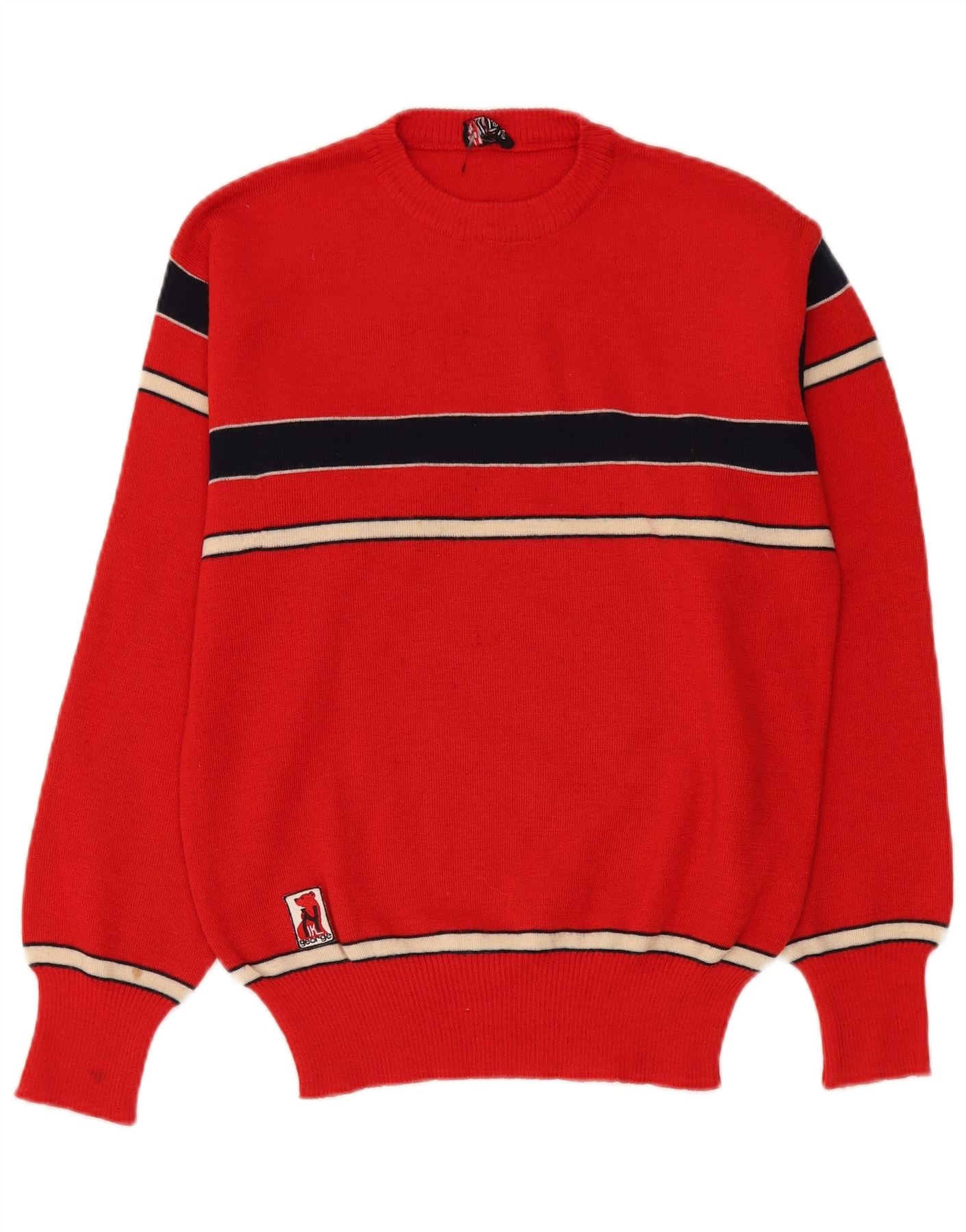 - Opis sztucznej inteligencji: Ten męski sweter z okrągłym dekoltem w stylu vintage jest wykonany z wygodnej czerwonej dzianiny. Posiada klasyczny okrągły dekolt i długie rękawy zakończone mankietami. Regularny krój zapewnia swobodę ruchu. Odważne granatowo-białe paski zdobią klatkę piersiową i rękawy, dodając stylu retro. Subtelny detal z logo dopełnia projekt, oferując ponadczasowy, swobodny styl.