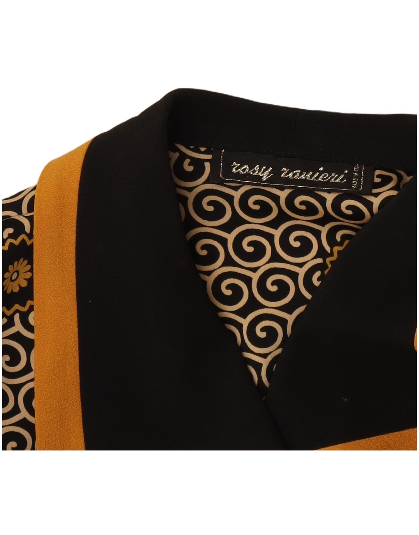 - Opis sztucznej inteligencji: Ta damska kurtka w stylu vintage jest wykonana z tkaniny. Charakteryzuje się efektownym czarno-złotym geometrycznym wzorem. Dekolt z kołnierzykiem i długie rękawy nadają klasycznej sylwetce. Tonalne zapięcia na guziki biegną wzdłuż przodu. Żółta lamówka podkreśla kołnierzyk i przednie kieszenie. Regularny krój zapewnia wygodę noszenia. Ten element inspirowany stylem retro dodaje charakterystycznego akcentu.