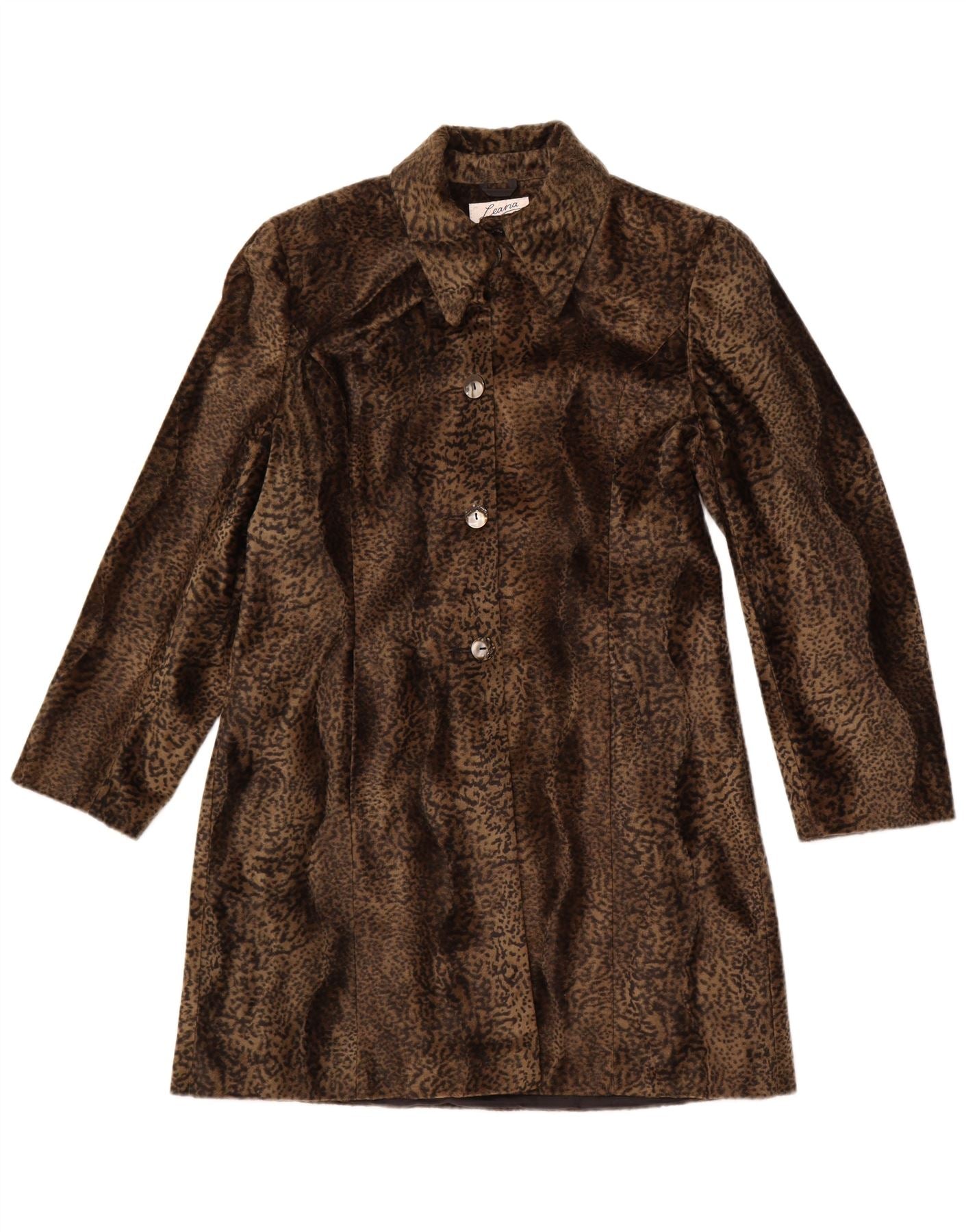 VINTAGE damski płaszcz ze sztucznego futra UK 14, średni brąz, poliester z nadrukiem zwierzęcym