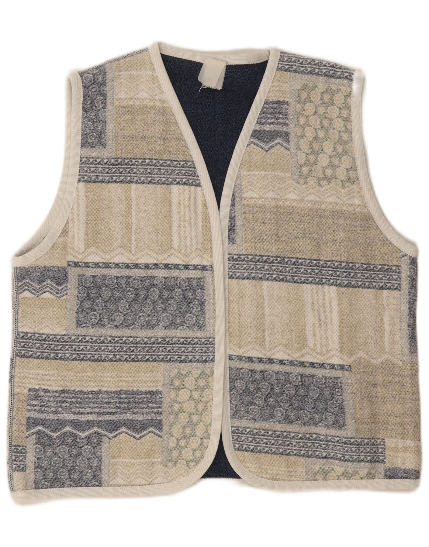 - Opis sztucznej inteligencji: Ta damska kamizelka w stylu vintage jest wykonana z wygodnej dzianiny. Charakteryzuje się charakterystycznym, wielobarwnym wzorem patchworkowym, łączącym odcienie beżu, błękitu i złamanej bieli. Krój bez rękawów i dekolt w kształcie litery V zapewniają klasyczną sylwetkę. Regularny krój zapewnia wygodę noszenia. Abstrakcyjny wzór dodaje wizualnego zainteresowania, dzięki czemu jest wszechstronnym elementem warstwowym.