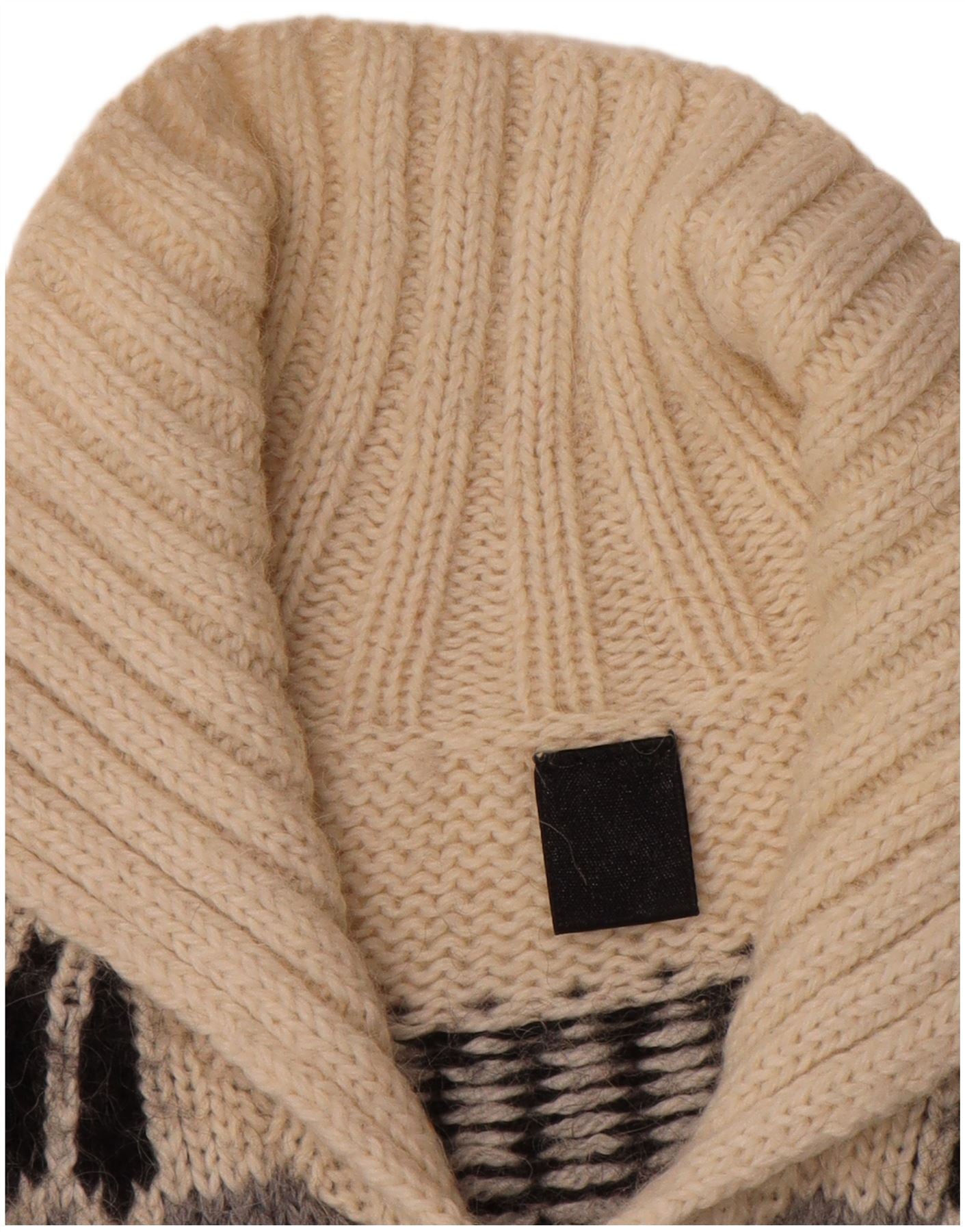 - Opis sztucznej inteligencji: Ten damski sweter rozpinany w stylu vintage jest wykonany z przytulnej dzianiny. Charakteryzuje się uderzającym wzorem Fair Isle w kolorze czarnym, złamanej bieli i szarości. Szalowy dekolt z kołnierzykiem dodaje klasycznego akcentu. Długie rękawy są zakończone mankietami dla wygody. Przód zapinany na guziki z gładkimi guzikami zapewnia regularne dopasowanie. Ten element oferuje ciepło i tradycyjny styl.
