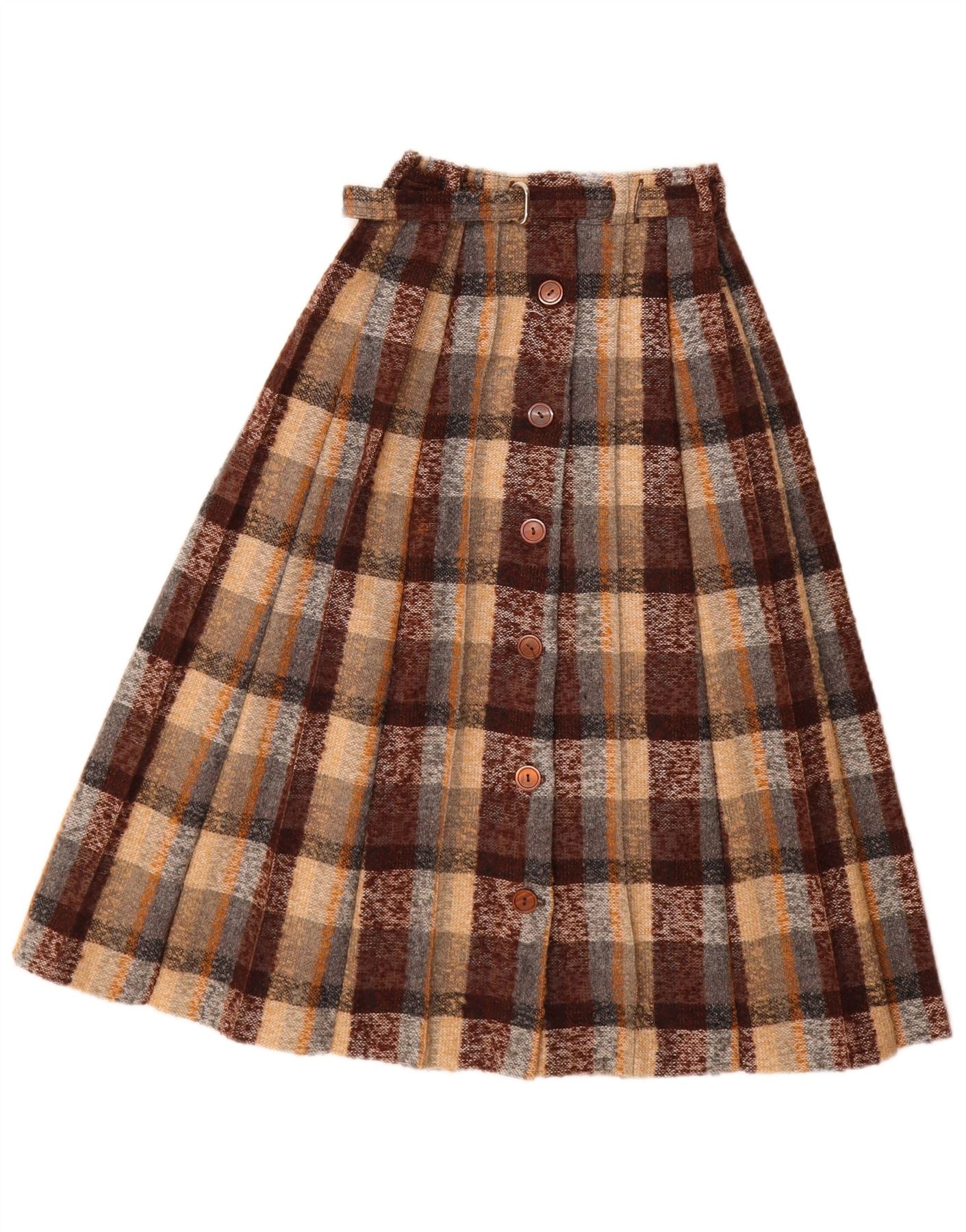 Vintage damska plisowana spódnica W24 XS w brązową kratę, nowa wełna