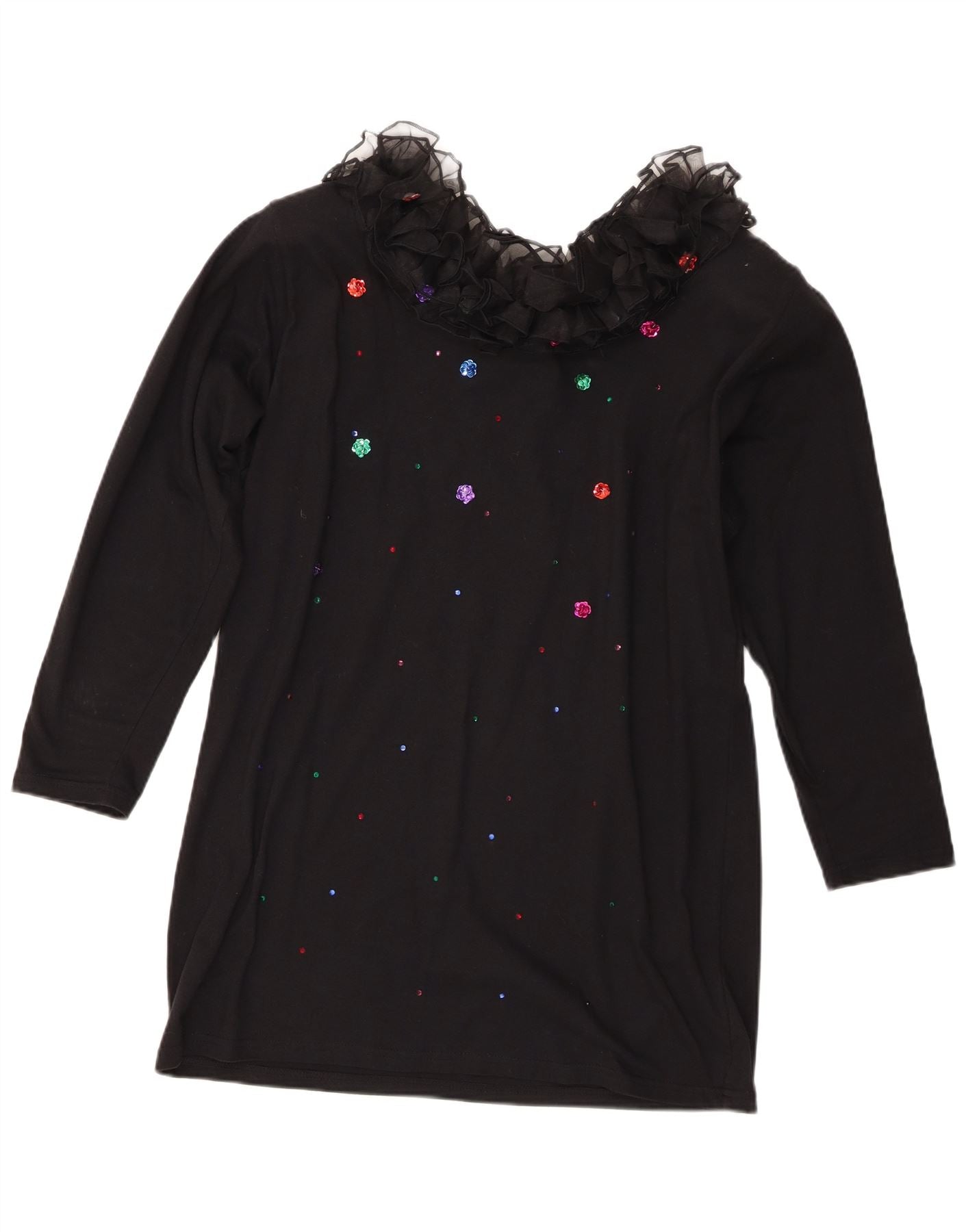 Vintage damska tunika z falbaną z przodu i długim rękawem, UK 16, duża czarna bawełna