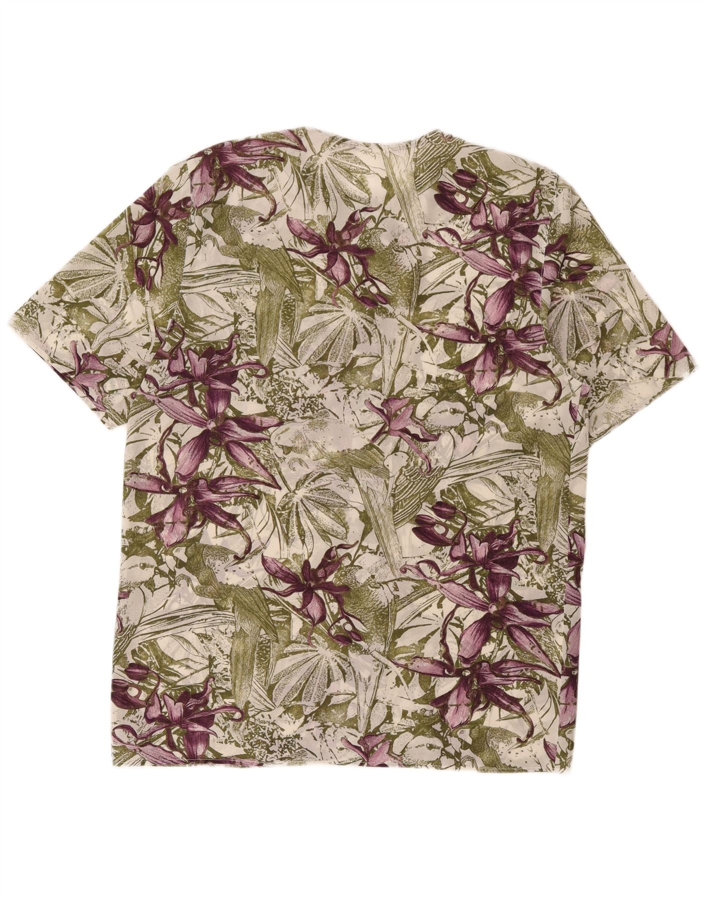 - Opis sztucznej inteligencji: Ta koszula damska w stylu vintage jest wykonana z lekkiej tkaniny. Charakteryzuje się żywym kwiatowym wzorem w odcieniach zieleni, fioletu i bieli. Koszulka ma okrągły dekolt i krótkie rękawy, idealna na ciepłą pogodę. Przód zapinany na guziki zapewnia łatwe noszenie. Oferuje wygodny, regularny krój. Pojedyncza kieszeń na piersi dodaje praktycznych szczegółów temu tropikalnemu stylowi.