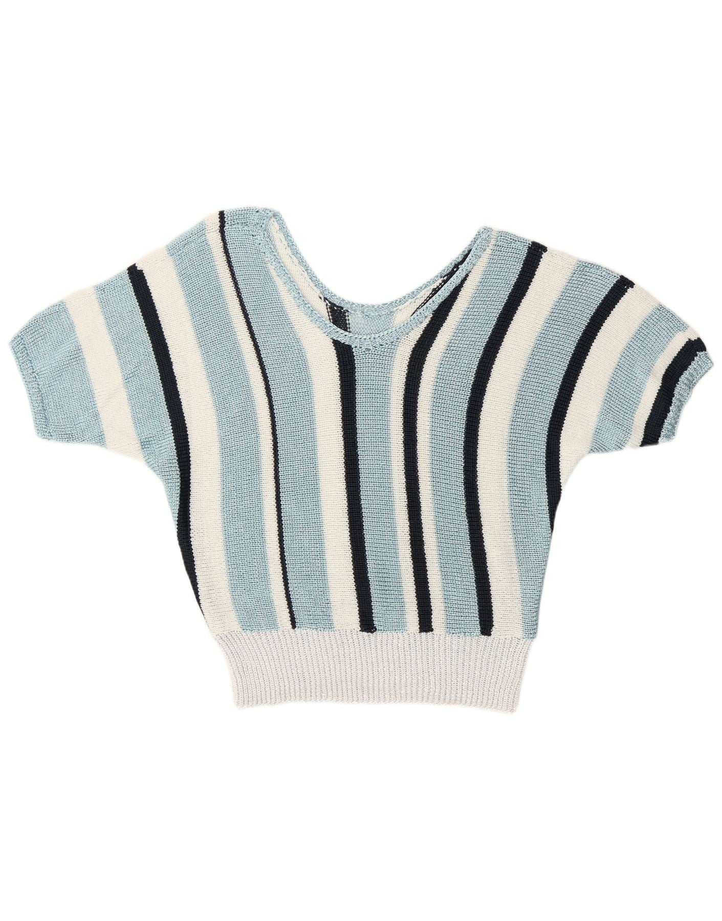 Sweter damski w stylu vintage z dekoltem w kształcie litery V, UK 12, średni niebieski w paski, retro