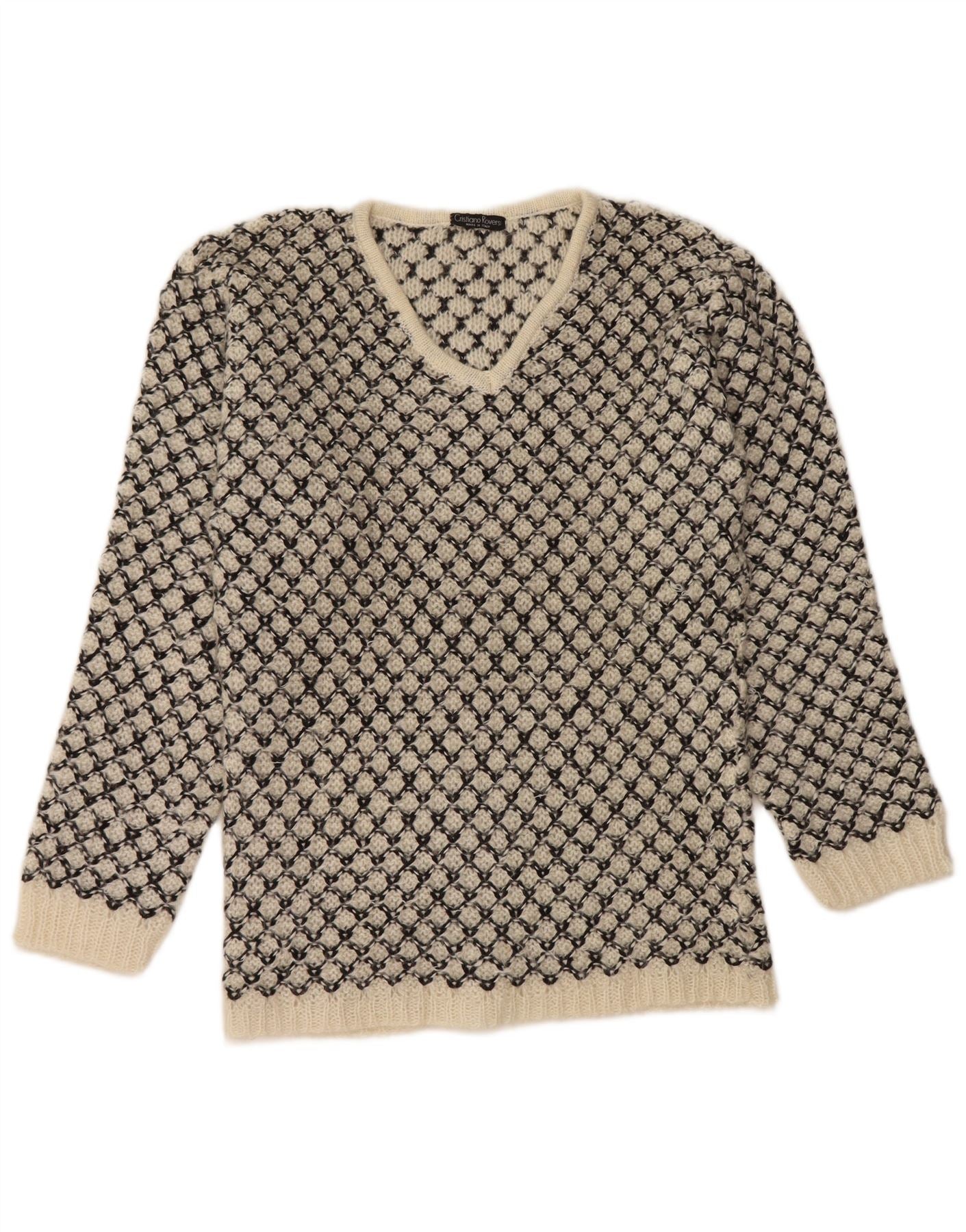 Sweter damski w stylu vintage z dekoltem w kształcie litery V, UK 14, średni, złamany biały geometryczny