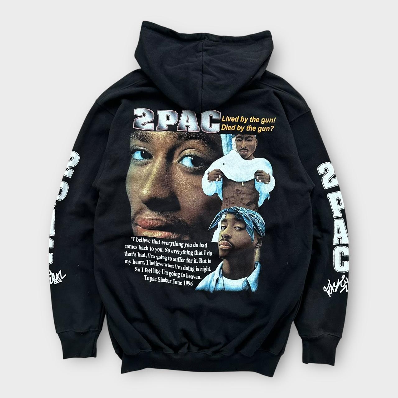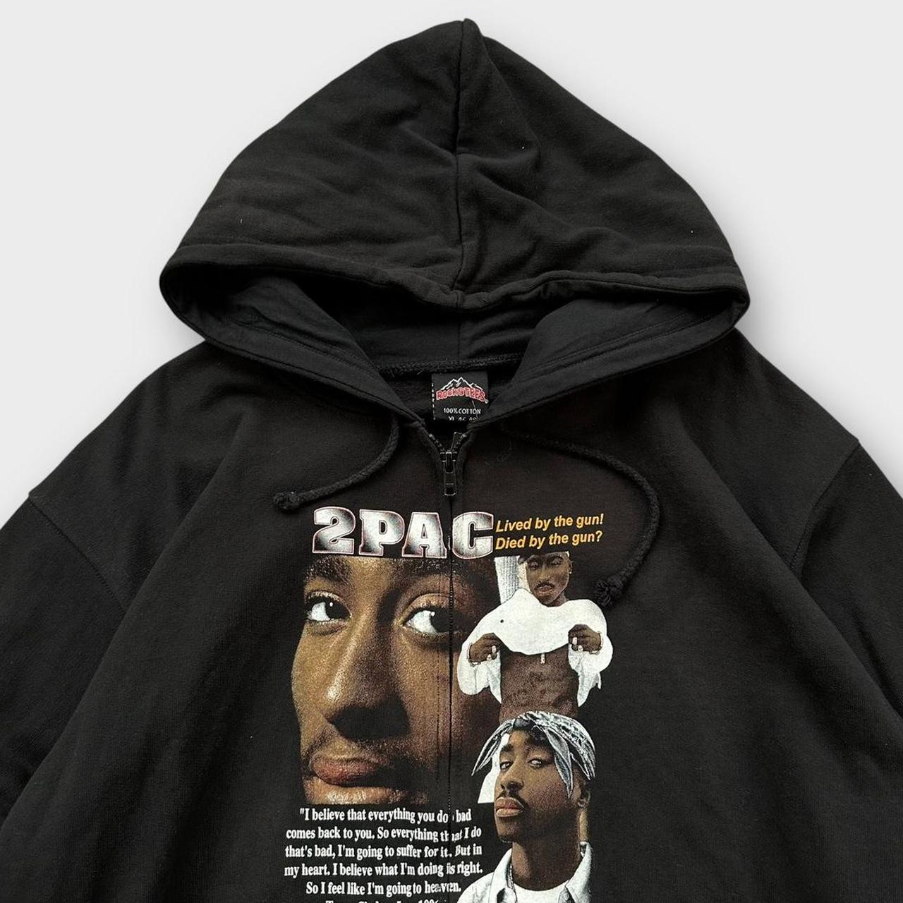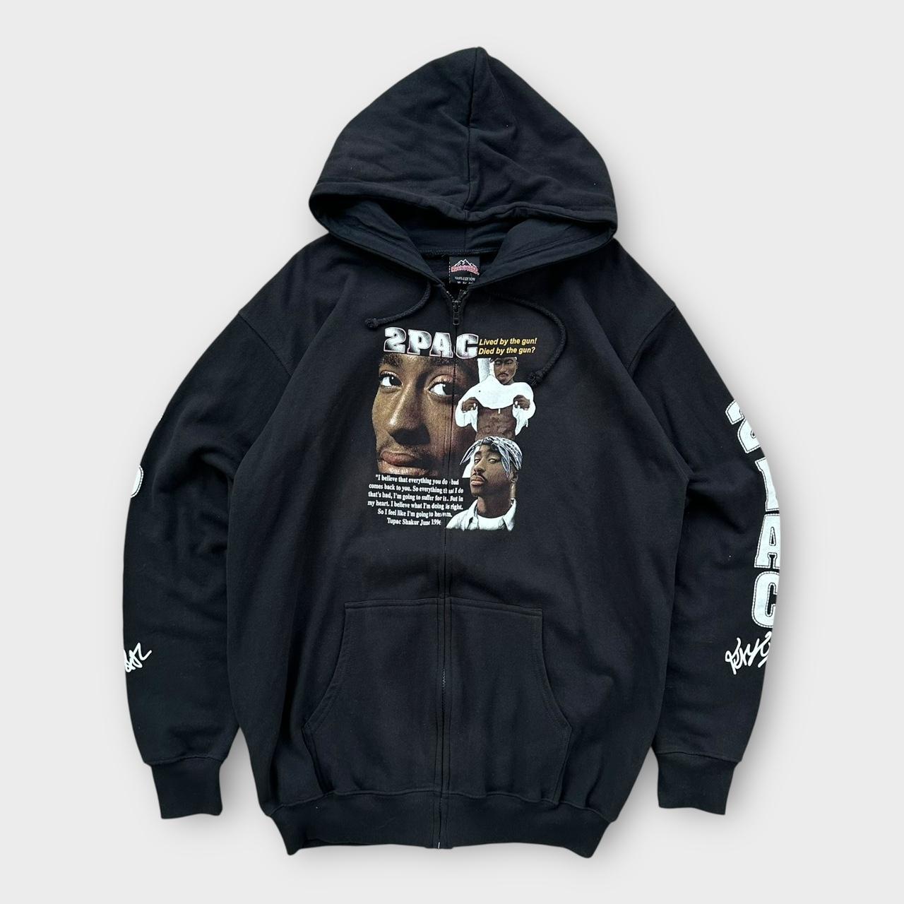 Czarna, zapinana na zamek bluza z kapturem Y2K Tupac z grafiką hiphopową Tupac firmy Rock@tees, z początku XXI wieku, z graficznym nadrukiem na piersi i plecach oraz napisami wzdłuż ramion