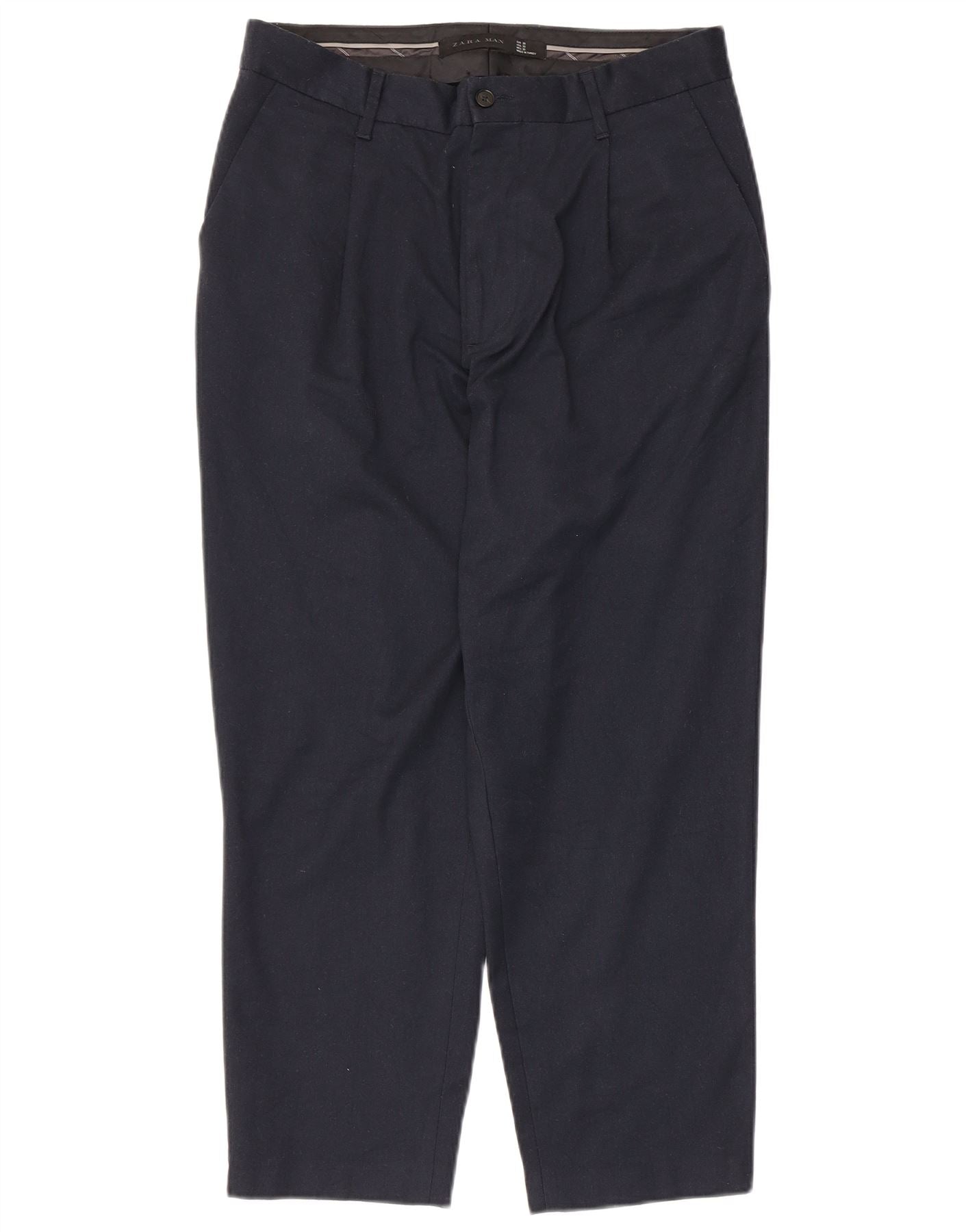 - Opis sztucznej inteligencji: Te męskie spodnie Zara są wykonane z granatowej tkaniny poliestrowej. Charakteryzują się luźnym krojem, zapięciem na zamek błyskawiczny i eleganckimi zakładkami z przodu. Zwężane nogawki nadają nowoczesną sylwetkę i są wykończone na skróconej długości. Dla wygody dołączono praktyczne kieszenie. Ten klasyczny styl zapewnia zarówno wygodę, jak i nowoczesny wygląd w codziennym noszeniu.