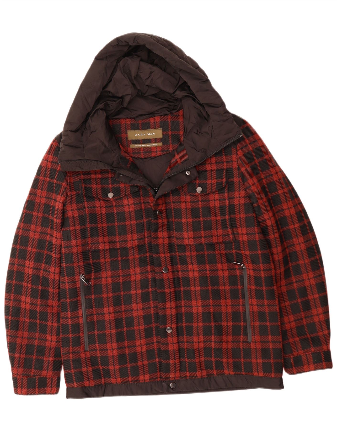 Męska kurtka bomberka z kapturem ZARA UK 40, duża, poliestrowa w czerwoną kratę