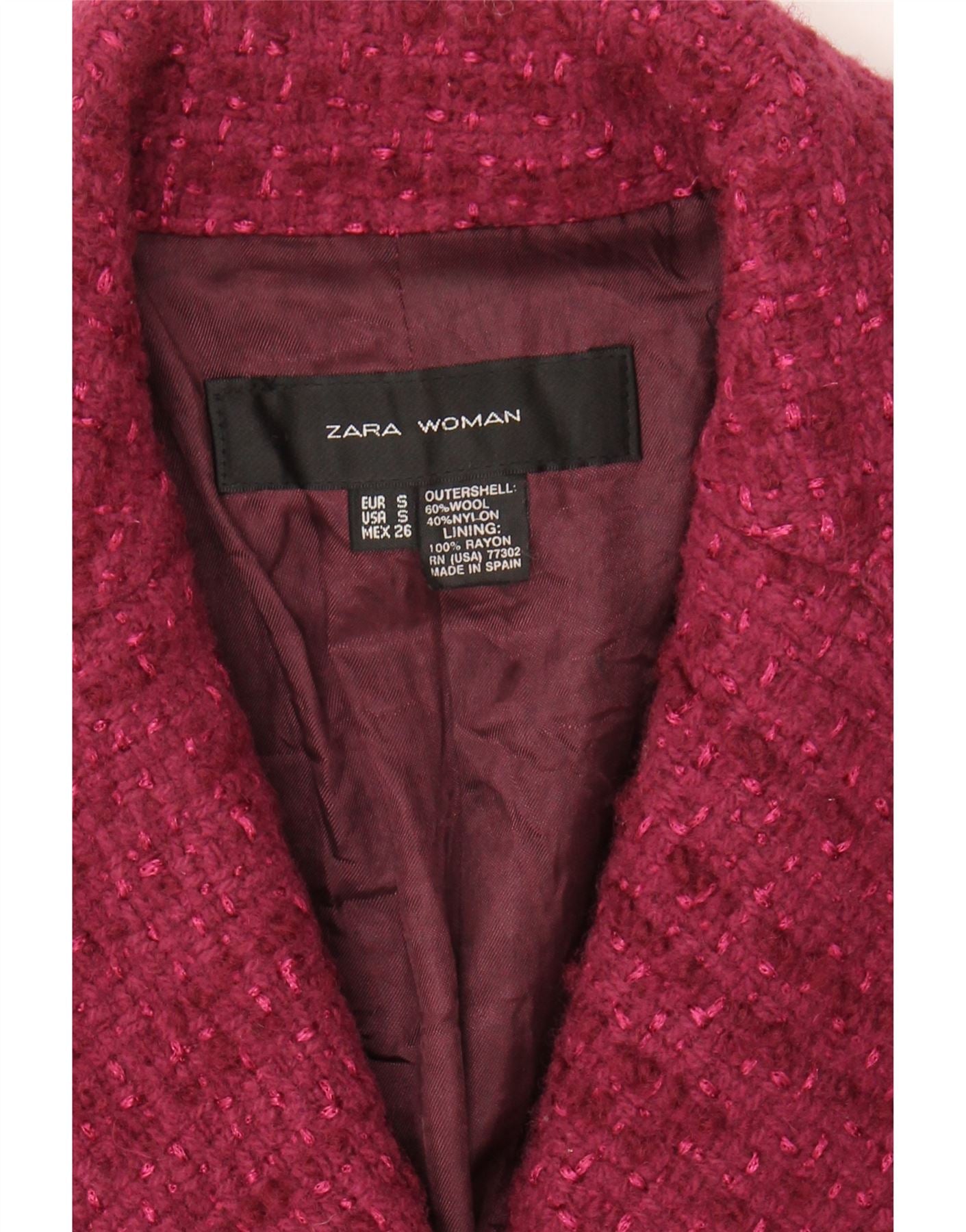 - AI Description: This Zara women’s jacket is crafted from a rich burgundy wool-blend tweed, offering both warmth and a refined texture. It features a classic collared neckline and long sleeves. A single button closure elegantly defines the front. The fabric boasts a subtle flecked pattern, complemented by functional pockets. Its regular fit provides a comfortable yet structured silhouette, perfect for a sophisticated look.