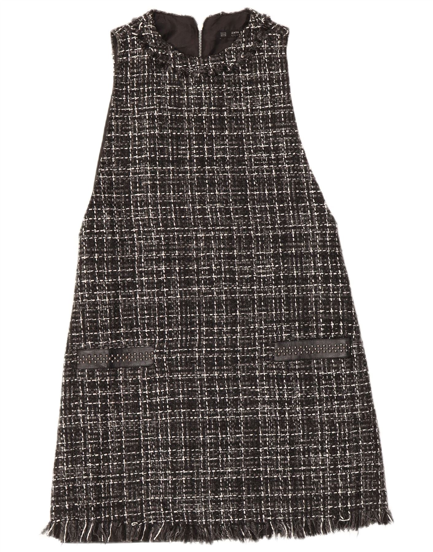 - Opis sztucznej inteligencji: Ta damska sukienka typu shift Zara jest wykonana z czarno-białej tweedowej dzianiny z teksturowanym wzorem w kratkę. Ma wysoki dekolt i krój bez rękawów, co tworzy elegancką sylwetkę. Luźny krój zapewnia wygodę noszenia. Zamek błyskawiczny z tyłu zapewnia czyste wykończenie. Dół zaakcentowany jest stylowymi frędzlami, co dodaje współczesnego akcentu. Ta sukienka jest w pełni podszyta dla dodatkowego komfortu i struktury.